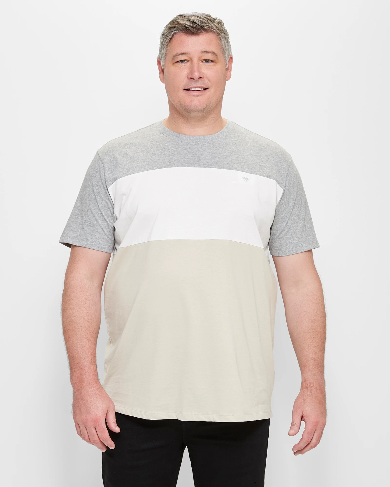 Step up your style with our Plus Size Australian Cotton Blend Colour Block T-Shirt. Crafted from a blend of Australian cotton and viscose, our tee offers a comfortable and lightweight feel. Its colour-blocked design in grey, white and stone adds a trendy touch to your wardrobe. Perfect for everyday wear, the tee features a ribbed crew neckline, short sleeves, and double flag embroidery on the side of the chest. Don't miss out on the chance to elevate your look with our versatile tee today!