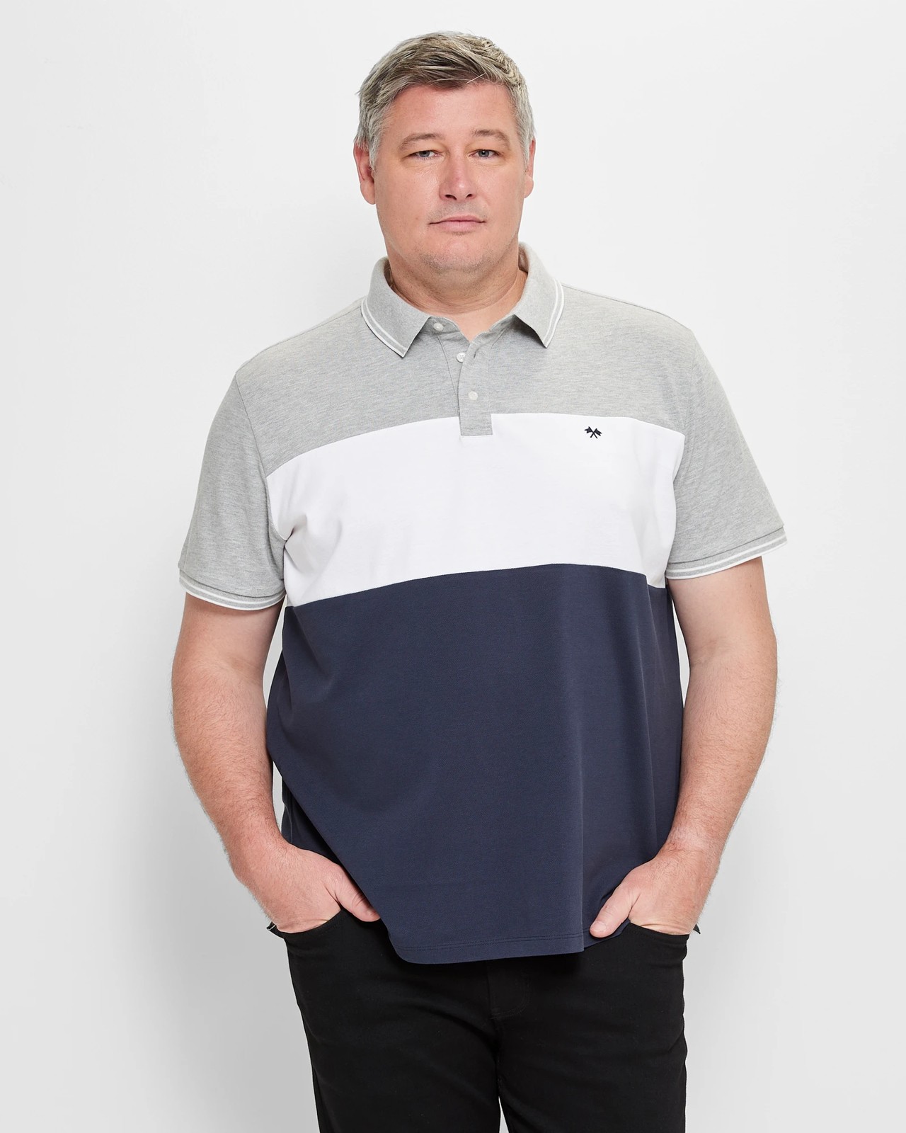 Introducing our Plus Size Australian Cotton Blend Panelled Polo Top, meticulously fashioned from a blend of cotton and viscose and featuring Australian cotton. Presented in a sophisticated palette of grey, white, and navy, with large panelled sections, our polo top is not just attire; rather, a statement of elegance and versatility. The embroidered cross-over flags on the chest add a distinctive touch, while the contrasting stripes at the collar and cuffs infuse a dash of flair. Its classic button-down front and straight hemline, complemented by subtle side seam splits, ensure a fit that's both comfortable and stylish. Make a seamless transition from casual meetings to leisure outings. Elevate your wardrobe now with our chic, plus size polo top.