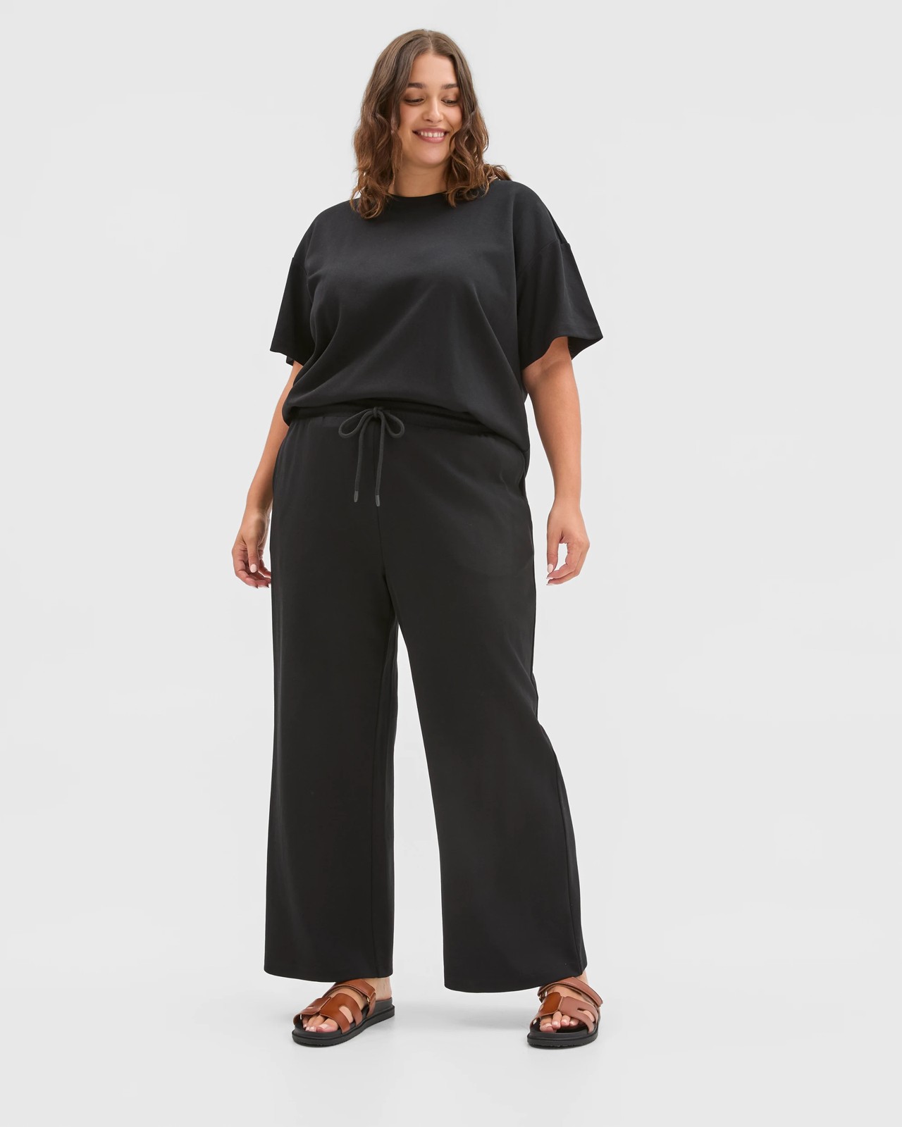 Enjoy comfort and easy-going style every day with these Plus Size Australian Cotton Blend Wide Leg Interlock Pants. Blended from Australian cotton and recycled polyester, the material feels soft and gentle on your skin. The wide leg, regular fit and elasticated waistband with drawcord offer plenty of freedom and a flexible fit for all shapes. Side seam pockets make slipping your essentials into place a breeze, whether you're relaxing or out and about. The straight hem and full-length design offer a relaxed, timeless look that pairs well with your favourite tops. Add these versatile trousers to your wardrobe and discover how simple comfort and style can truly be.