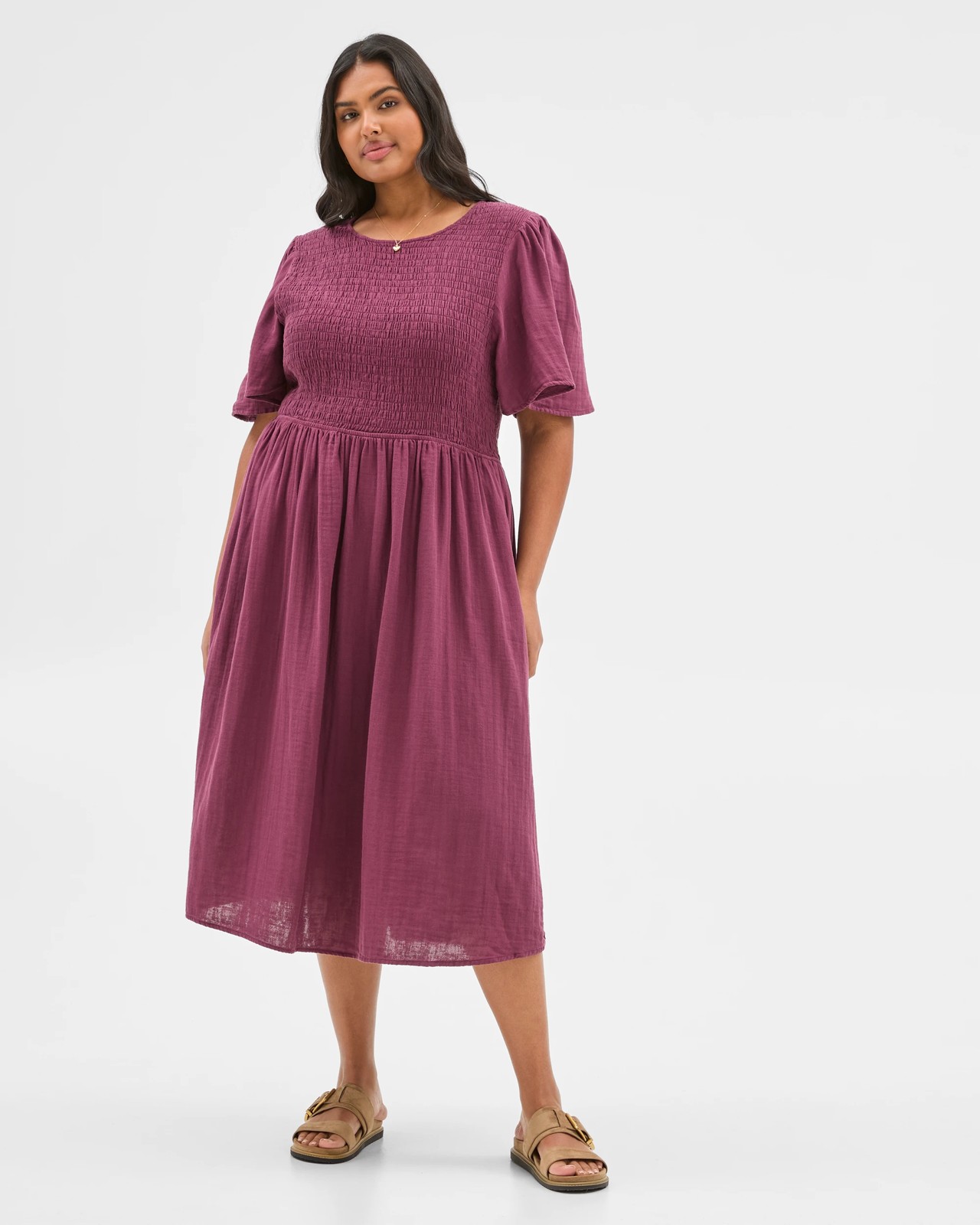Step into confidence with this Plus Size Australian Cotton Double Cloth Shirred Dress. Its soft, textured double cloth cotton ensures you stay cool and comfy all day, while the shirred bodice and elastic waist gently shape your figure for easy wear. With a beautiful mauve wine hue, short flutter sleeves and handy side pockets, this midi-length dress is perfect for casual outings or relaxed get-togethers. Enjoy a relaxed regular fit that moves with you, making every moment feel a little brighter. Treat yourself to easy-going style and comfort today.