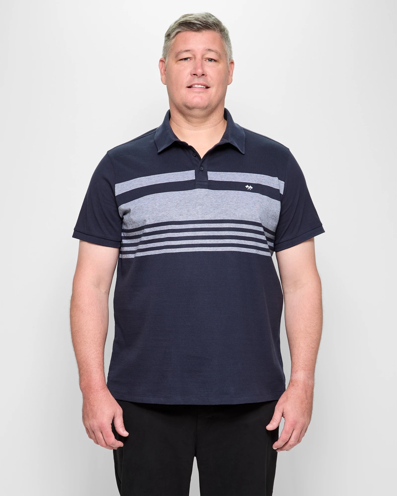 Discover the perfect blend of comfort and style with our Plus Size Australian Cotton Engineered Stripe Polo Top. Made from high-quality Australian cotton, this top is incredibly light and airy, keeping you cool and comfortable all day long. The rich navy blue colour, along with the ribbed collar and button-down front, provides a timeless and versatile look ideal for casual occasions. The unique stripe pattern across the chest adds a touch of individuality, while the regular fit and side seam splits ensure complete ease of movement. Perfect for a relaxed weekend or a friendly gathering, this polo top is an essential addition to your wardrobe. Get yours today and enjoy unmatched comfort and style.