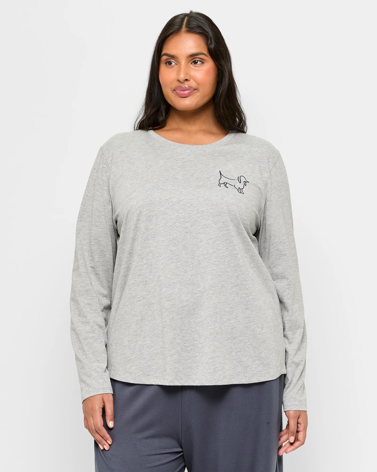 Enjoy the ultimate comfort with our Plus Size Australian Cotton Long Sleeve Slogan Sleep T-Shirt. Made from a soft cotton and viscose blend, this breathable shirt is perfect for a good night's sleep. The regular fit features a trendy grey marle design and a quirky squiggle dog print on the chest. With a ribbed round neckline, long sleeves, and a curved hemline, it combines style and comfort effortlessly. Embrace a cosy night's sleep and add a touch of playfulness to your bedtime routine.