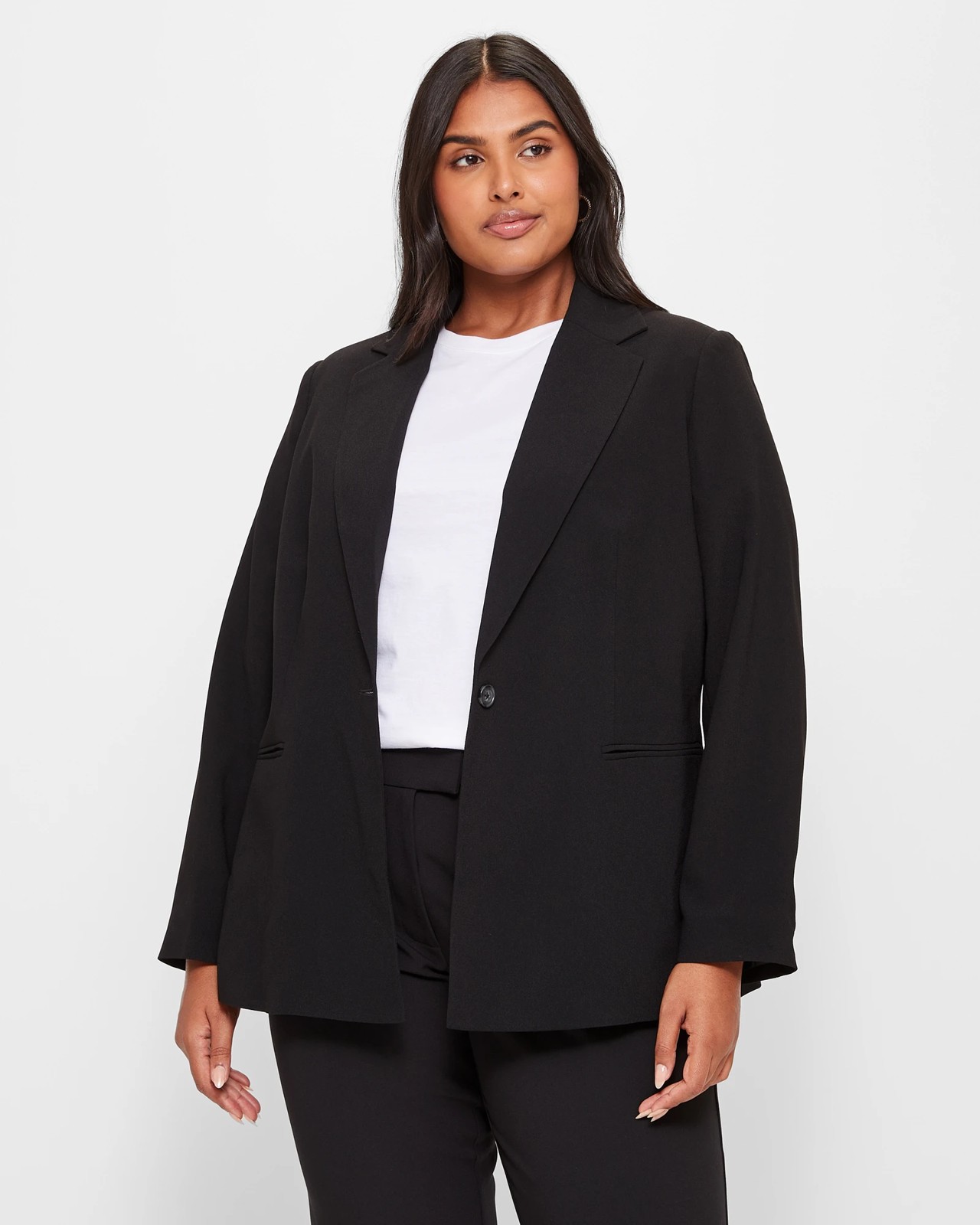 Step into elegance with our Plus Size Blazer. The black blazer features a round collared neckline with lapels, long sleeves, and a single-breasted button front closure. With front pockets and a straight hemline, it combines practicality with style. A back bottom centre split ensures ease of movement, so you can stride with confidence. Perfect for both work and social occasions, this blazer is a versatile wardrobe essential. Don't miss out on adding this must-have to your collection!