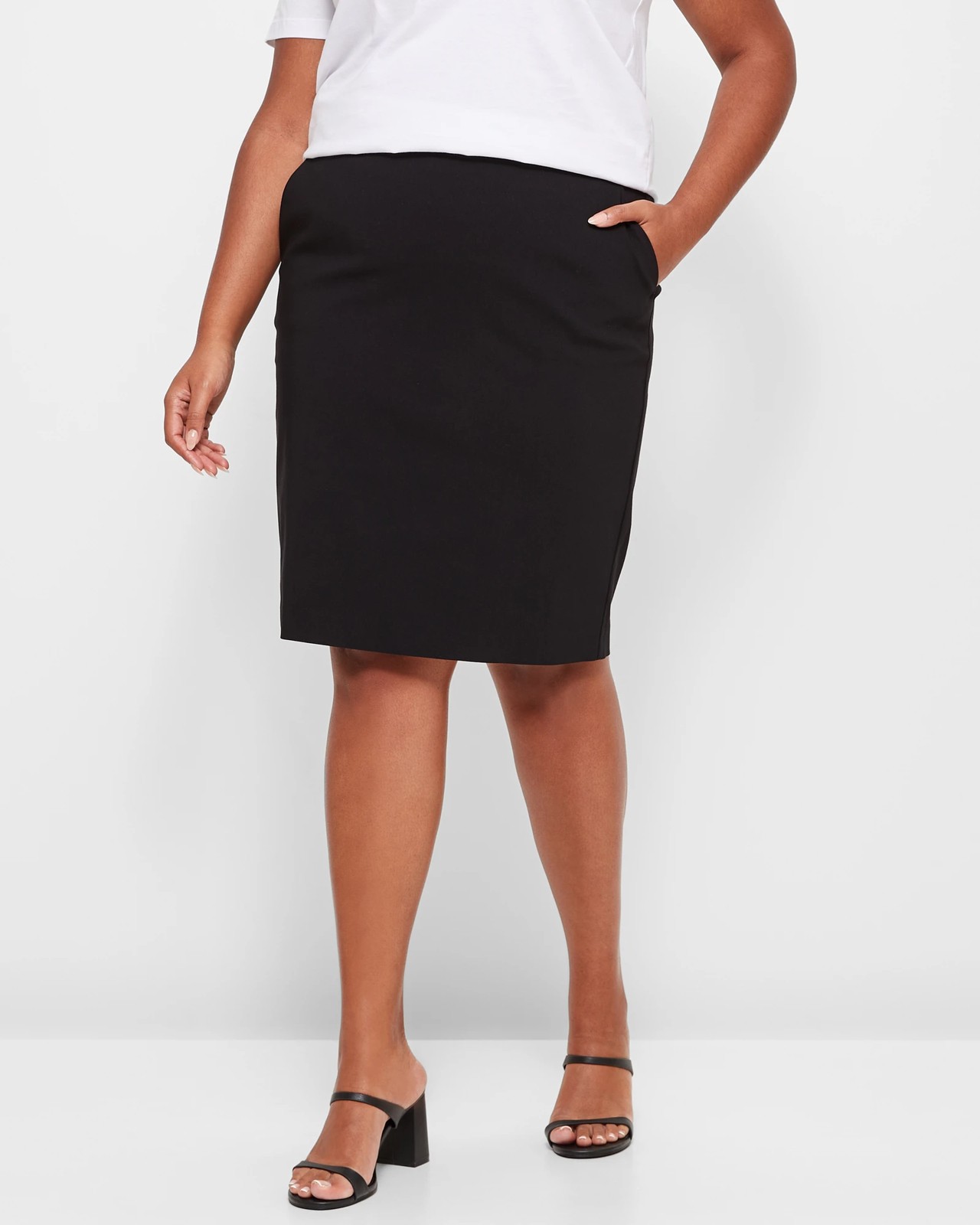 Step into confidence with the Plus Size Carrie Skirt, thoughtfully designed to perfectly flatter a fuller figure. Made from a blend that offers the right amount to stretch, this skirt ensures all-day comfort and style. Featuring a pull-on design and a thick flat elastic waistband, it promises a regular fit while the side pockets add a practical touch. Whether you're heading to work or out for a casual day, the sleek black finish and straight hemline make it a versatile choice. Don't forget the back centre bottom split that provides ease with every step. Try it on now and feel fabulous!