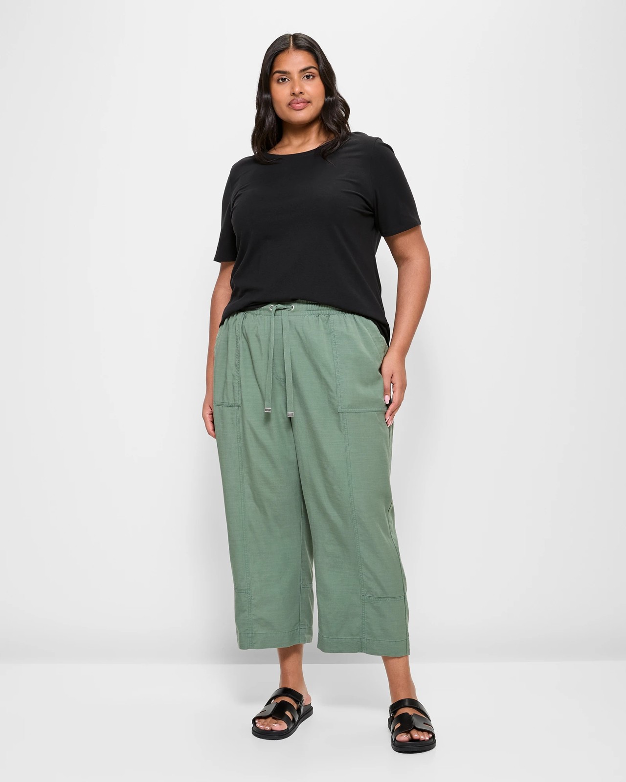 Step into comfort and style with our Plus Size Casual Crop Length Jogger Pants. Made from a luxurious blend of lyocell, viscose, and cotton, these joggers offer a lightweight feel perfect for any casual outing. The high-waisted design and thick elastic waistband with drawstring ensure a secure fit, while the exposed large front pockets and relaxed leg give you ample room to move. Finished in a striking laurel wreath green, these joggers feature a mock fly front and open back pockets for added flair. Whether you're meeting friends or lounging at home, these jogger pants are an essential addition to your wardrobe. Order yours today and experience unparalleled ease and sophistication.