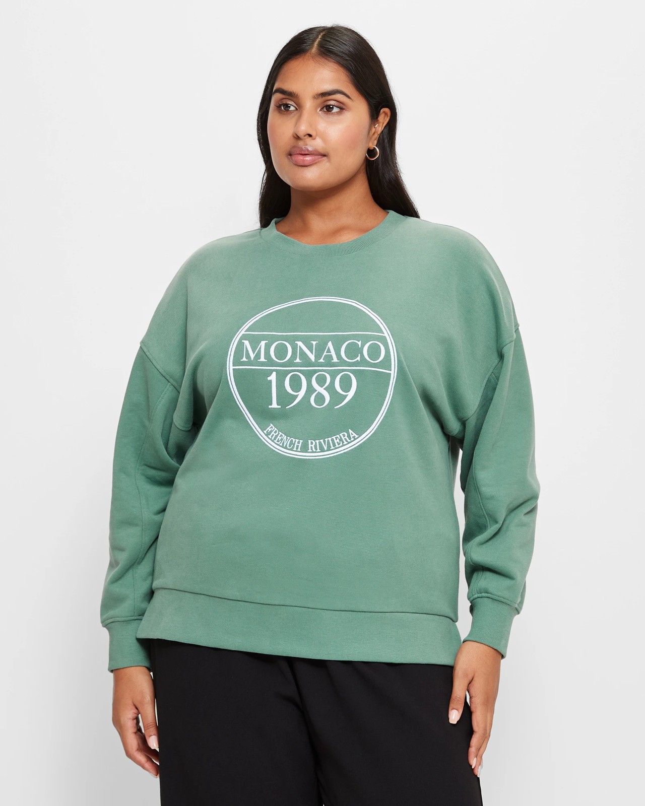 Upgrade your winter wardrobe with this Plus Size Crew Neck Fleece Jumper. Crafted specifically for fuller figures, this jumper provides the perfect fit and comfort you need. Made from a breathable cotton fabrication, it keeps you warm without sacrificing breathability. The sea green colour adds a pop of style to your outfit. Featuring a ribbed crew neckline, long ribbed cuff sleeves, and a straight ribbed hemline, this jumper offers a classic look with a modern twist. The bold chest print MONACO 1989 FRENCH RIVIERA adds an edgy touch to the design. With side seam splits and a longline design, it creates a flattering silhouette. Whether you're heading out for a casual day out or a cosy night in, this jumper is a must-have addition to your collection. Get yours now and stay stylishly comfortable all winter long!