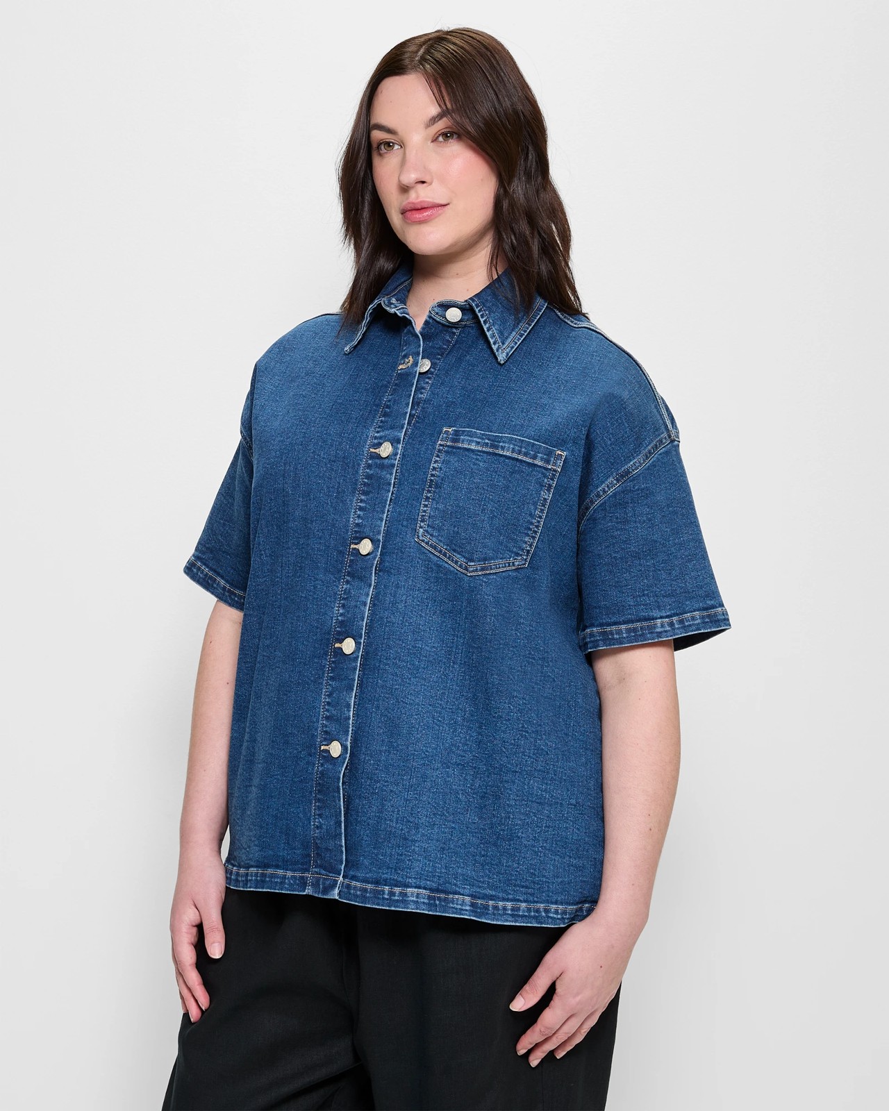 Step out in both comfort and style with our Plus Size Denim Shacket. Designed from a cotton-rich fabric with a hint of stretch elastane, it promises all-day comfort. The relaxed fit in an arctic blue shade makes it a versatile addition to your wardrobe. Finished with a classic round collared neckline, practical button-through front, and open chest pocket, this shacket is perfect for layering. Embrace effortless chic with this trend-setting denim piece – make it yours today!