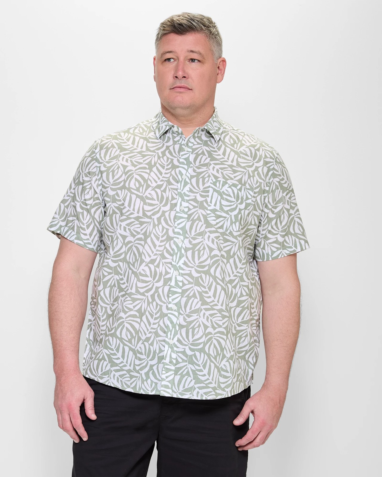 Experience the perfect blend of comfort and style with our Plus Size European Linen Blend Print Shirt. Designed from a linen and cotton mix, it offers a gentle and airy feel against your skin. The shirt features a delightful all-over leaf pattern in a calming seagrass tone, ideal for any setting. Enjoy its regular fit, complemented by a round collared neckline, button-up front and short sleeves. With practical open chest pockets, a curved hemline and a back centre pleat, this shirt ensures freedom of movement for your everyday adventures. Add it to your wardrobe and make it your new favourite!