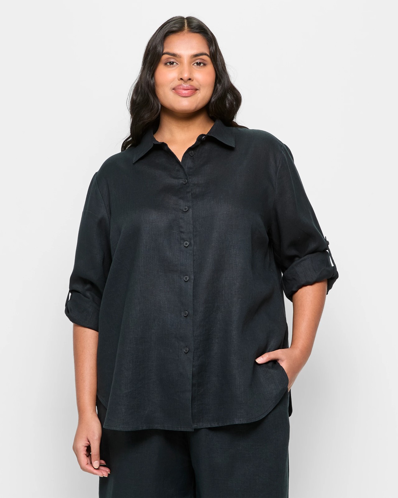 Discover comfort and style with this Women's Plus Size European Linen Long Sleeve Shirt. Made from high-quality linen, this shirt is light and breathable, making it perfect for all-day wear. The regular fit offers a comfortable silhouette, complemented by the classic round collar and button-through front. The long sleeves feature button cuffs and can be rolled up and secured with a tab and button for a relaxed look. Its curved hemline and centre pleat on the back yoke add a touch of class to any outfit. Refresh your wardrobe with this versatile piece.