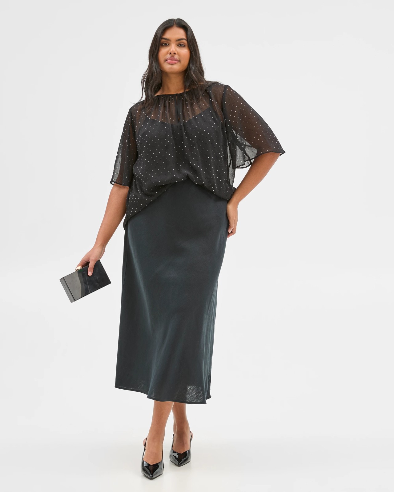 Step into any occasion feeling fabulous in our Plus Size Flutter Sleeve Diamante Blouse. This blouse is designed with a relaxed regular fit, perfect for adding a bit of sparkle to your wardrobe without sacrificing comfort. The flutter sleeves and sheer overlay deliver a dreamy touch, while dazzling diamantes catch the light for beautiful effect. With a detachable cami for coverage and a graceful curved hemline, you’ll discover style that’s truly versatile. It’s ideal for elevating your daytime look or making a subtle statement in the evening. Treat yourself and enjoy a confident, radiant feel.