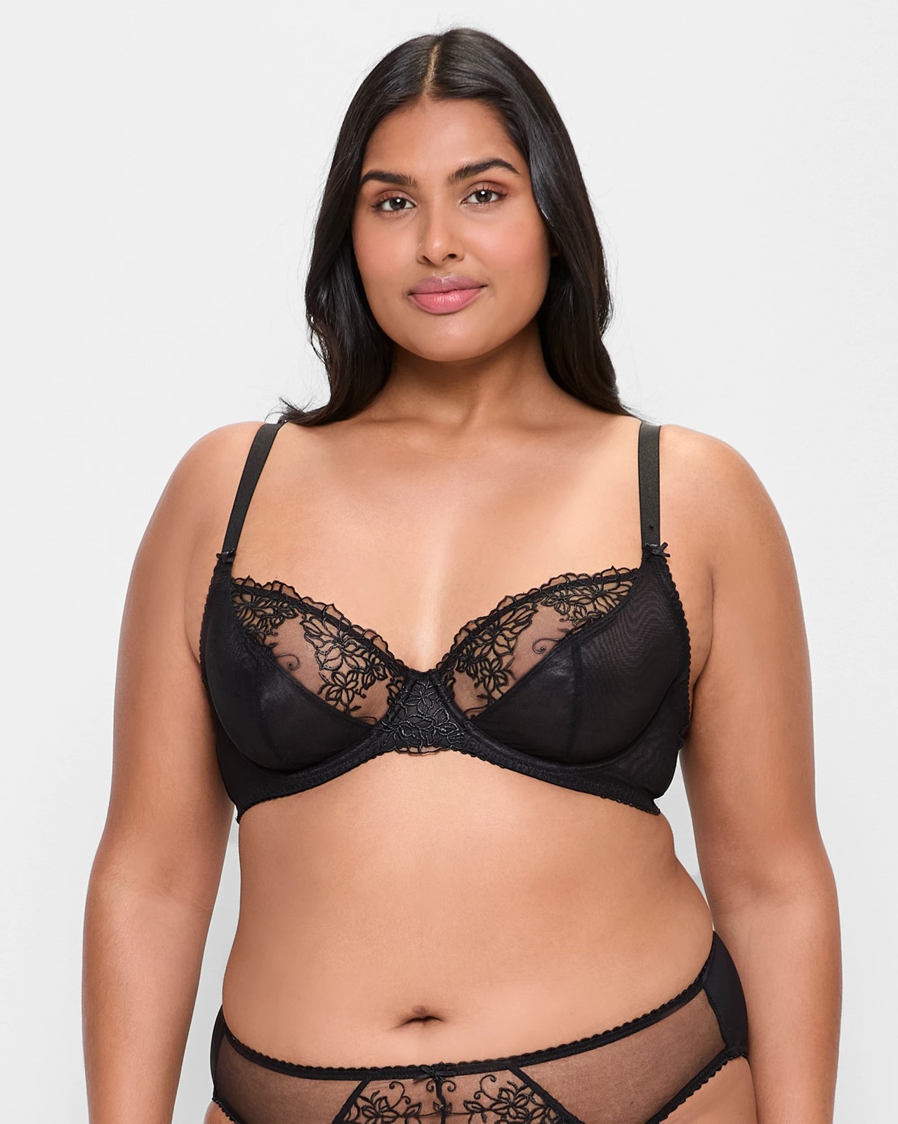 Experience style and comfort with the Plus Size Jade Embroidered Plunge Bra. Made from a luxurious blend of nylon and polyester, this bra includes a touch of stretch elastane for a perfect fit. The plunge neckline and thick adjustable shoulder straps allow for a personalised experience. Beautiful lace and mesh-covered cups, highlighted with decorative bows, offer a dash of feminine charm. The underwire and scalloped edges enhance both support and appeal. With a satin-feel back and a secure hook and eye closure, this bra promises all-day comfort. Complete your look by pairing with matching briefs, sold separately. Step into confidence today with your ideal fit.