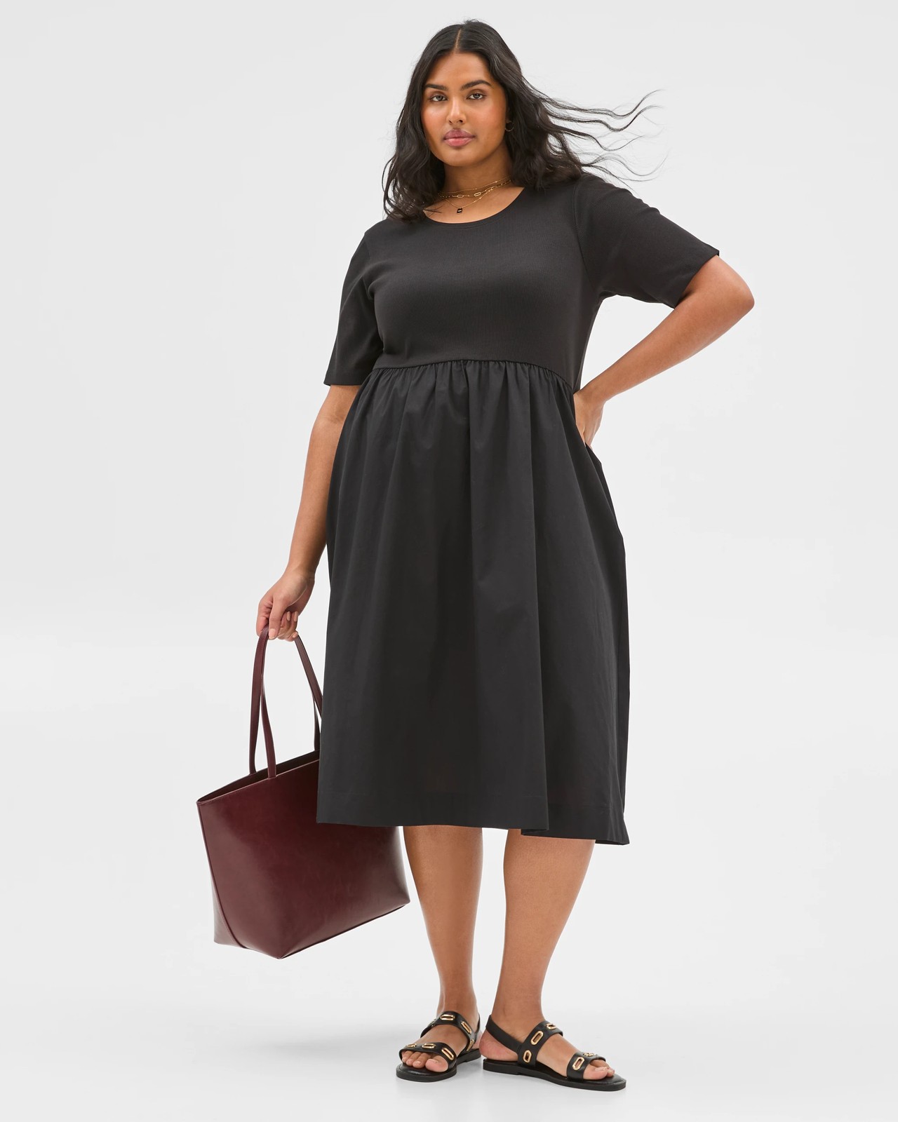 Discover the comfort and ease of this plus size knit and woven dress, made to move with you through every part of your day. The black cotton-rich fabric with added stretch feels soft and supportive, while the midi-length a-line skirt and gathered detail under the waist create a graceful look you'll love. Short sleeves and a classic round neckline offer versatility for every occasion, and the ribbed top sits comfortably against your skin. With handy side seam pockets and a straight hem, this stylish piece is perfect whether you're running errands or enjoying time out with friends. Refresh your wardrobe with this everyday favourite.