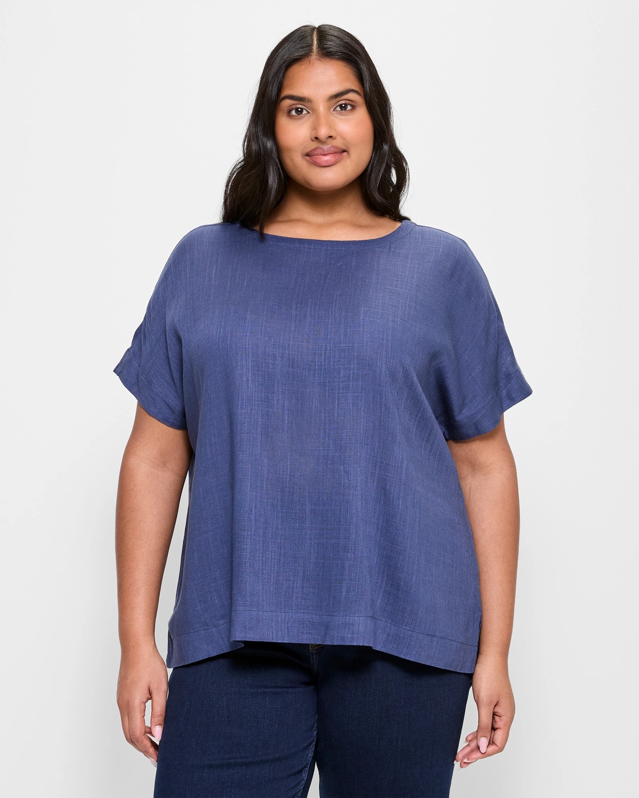 Discover the ultimate blend of comfort and style with our Plus Size Linen Blend Boxy Crew Top. Made from a luxurious viscose and linen mix, this top offers a light and airy feel, perfect for all-day wear. The oceana blue hue adds a refreshing touch, enhancing its versatile boxy cut and round neckline. With short cuffed sleeves and a straight hemline, this top features thoughtful details like side seam splits and a back button neck closure with a keyhole. Transform your wardrobe with this chic staple and enjoy effortless charm, whether you're dressing up for a special occasion or keeping it casual. Try it on and feel the difference!