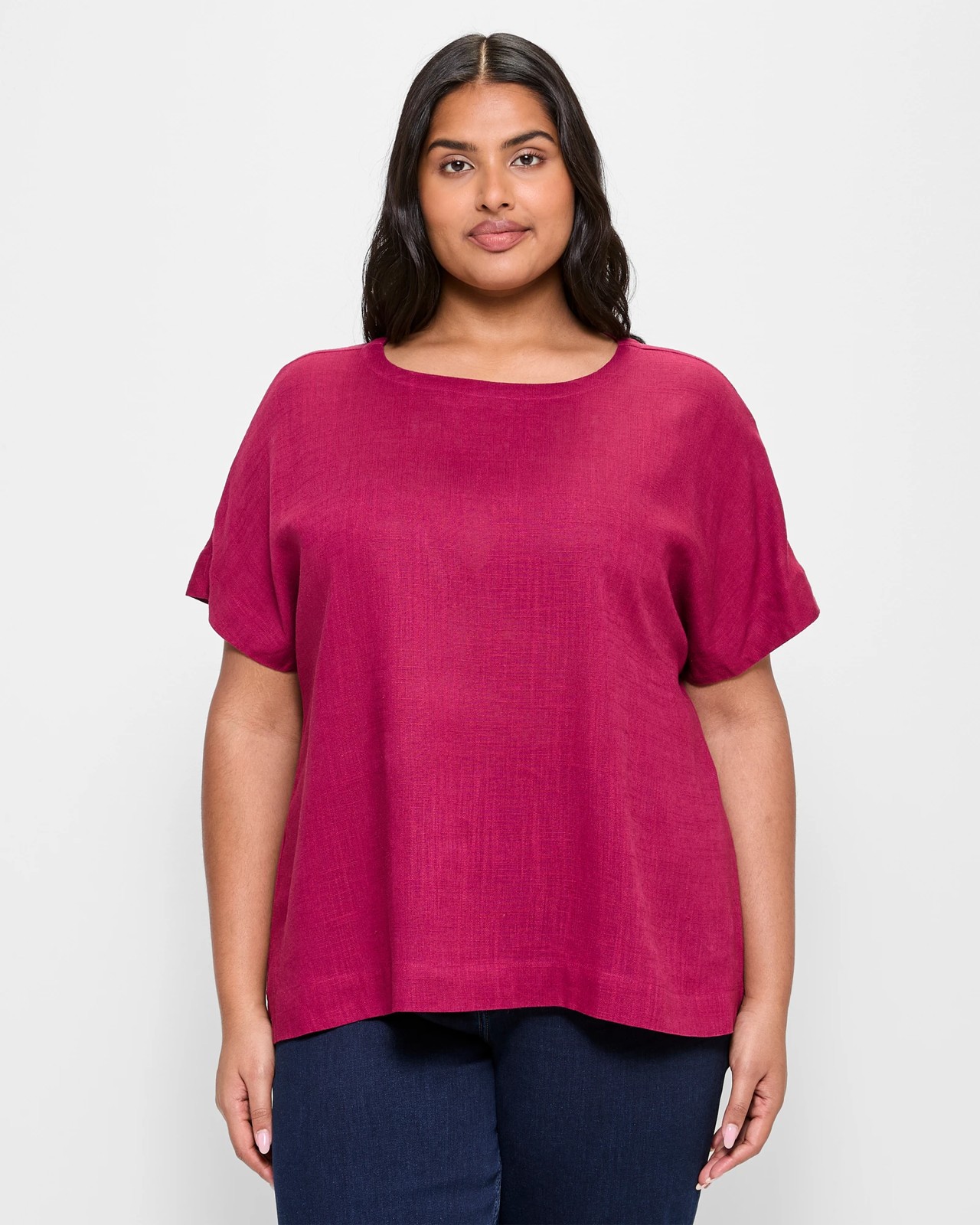 Experience ultimate comfort and understated style with our Plus Size Linen Blend Boxy Crew Top. Made from a soft viscose and linen blend, this top is perfect for those warm days when you want to stay cool and relaxed. Its boxy design provides a breezy, non-restrictive fit, while the raspberry hue adds a pop of colour to your wardrobe. Featuring a round neckline, short cuffed sleeves, and chic side seam splits, it's designed with both style and ease in mind. The back button neck closure with keyhole detail adds a touch of sophistication. It's versatile enough for both casual outings and more polished looks. Don’t miss out – add this essential piece to your collection today!