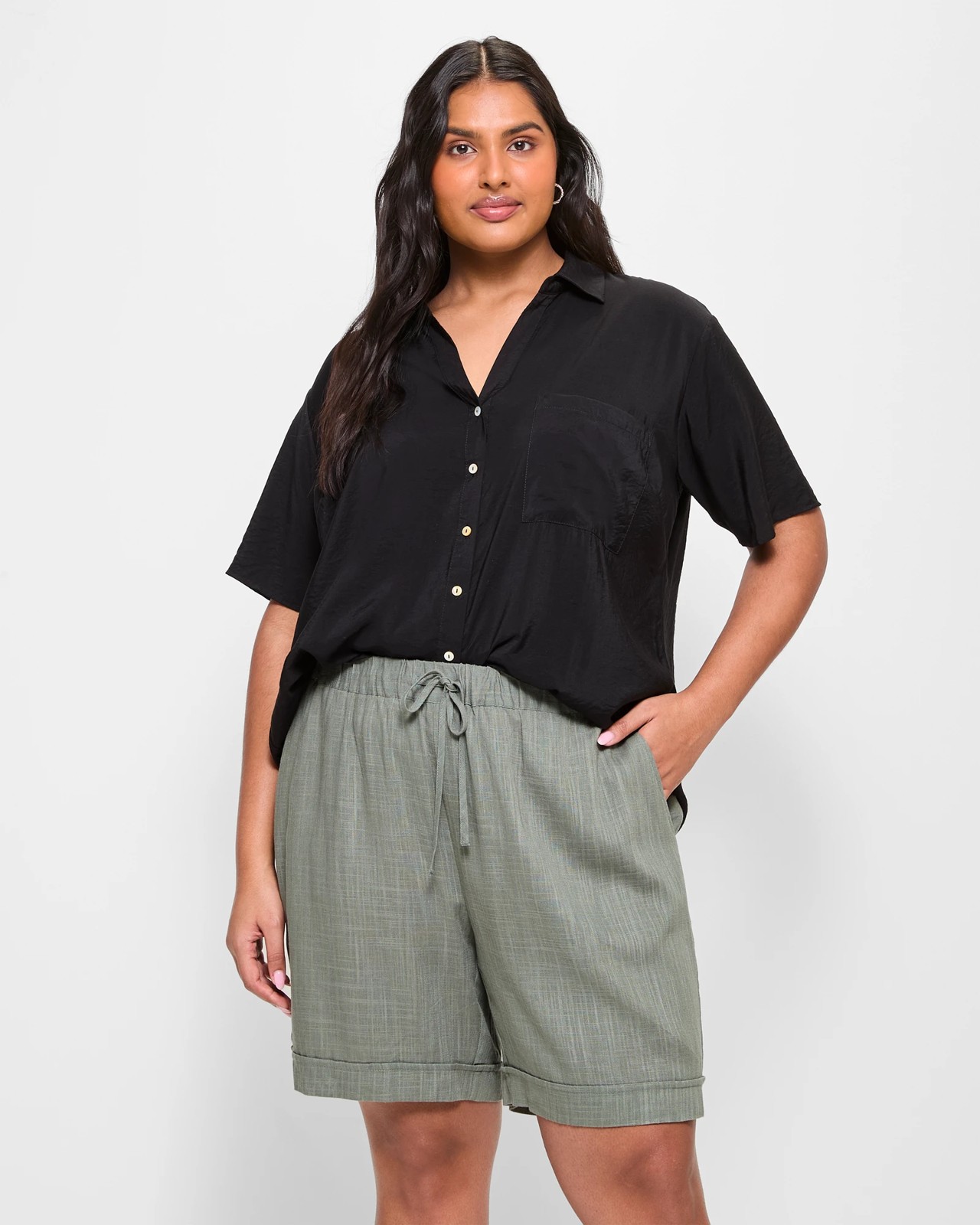 Introducing Target Curve's Linen Blend Shorts, designed specifically for a fuller figure. Crafted from a lightweight viscose and linen blended fabrication, these regular fit shorts are sure to keep you cool and comfortable all summer long. Featuring a thick elastic waistband with drawcord, side seam pockets, and roll cuff hemlines for an added touch of style. Enjoy the mid-length silhouette of these stylish linen blend shorts from Target Curve!