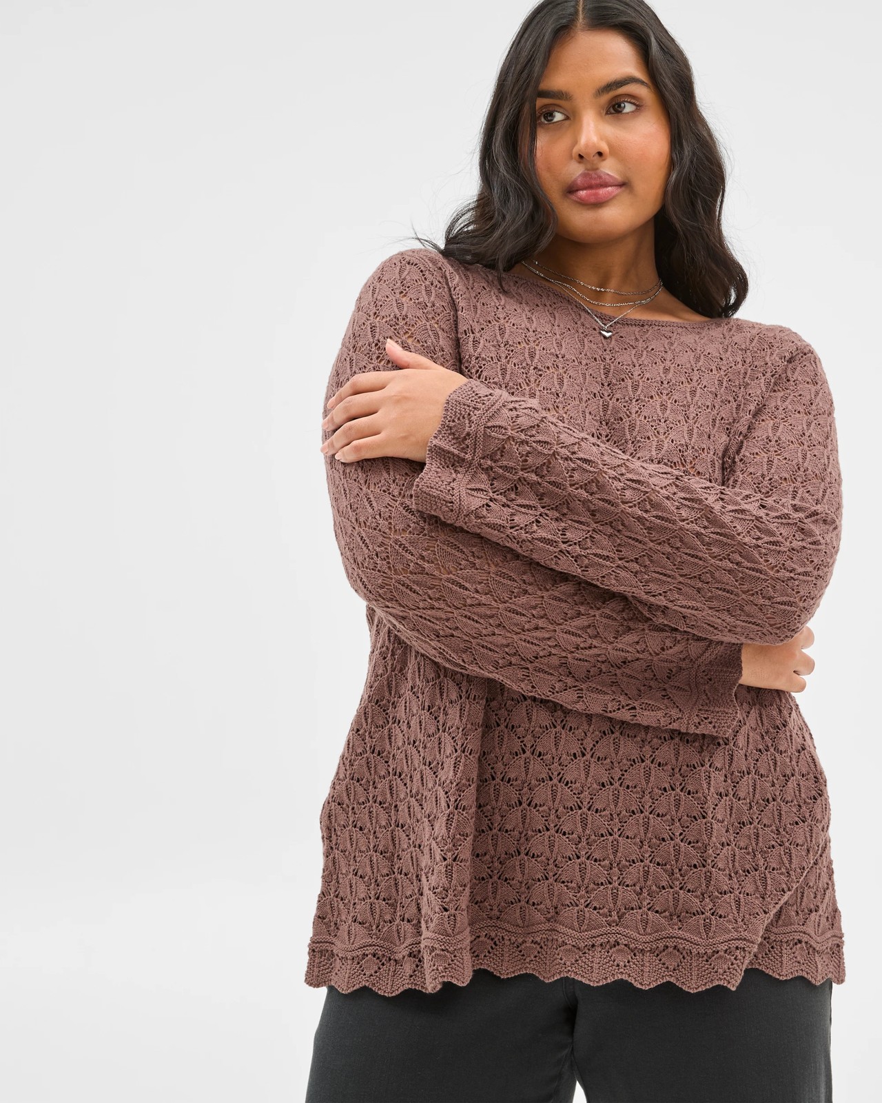 Step out with confidence in this plus size long sleeve crochet knit top, designed to make you look and feel wonderful every day. The soft chocolate shade flatters all skin tones while the lightweight cotton blend keeps you comfortable from morning coffee to evening strolls. Delicate crochet details and elegant scalloped edges add a special touch that completes your look with effortless charm. Whether you wear it to brunch with friends or for a relaxed weekend at home, this top offers both style and comfort in perfect harmony. Treat yourself to something lovely and enjoy the compliments that follow.