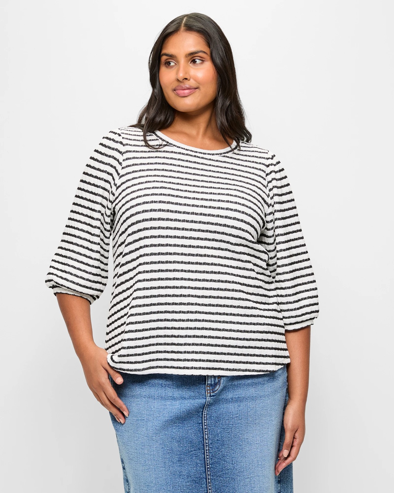Step into a world of comfort and style with our Plus Size Long Sleeve Textured Puff Sleeve Top. This top is made from a delightful combination of polyester and cotton, ensuring you stay comfortable while looking fabulous. The stretchy elastane means you can move freely, and the all-over textured look adds a unique touch. The stylish black and white stripes, round neckline, and 3/4 length puff sleeves with cuffs bring a modern twist to a classic design. Perfect for any occasion, it promises to keep you confident and chic. Get yours today and refresh your wardrobe.