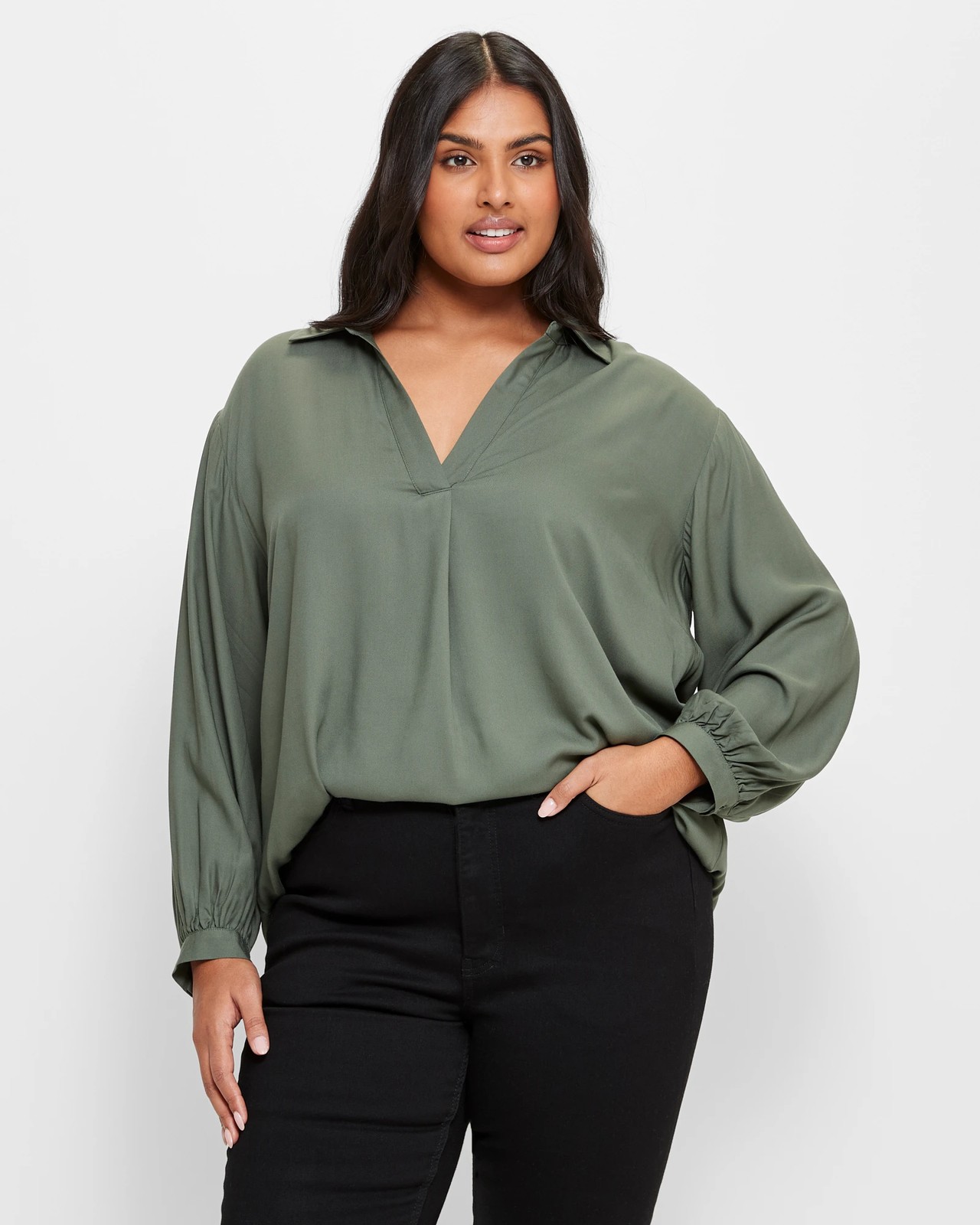 Discover the Plus Size Pleat Front Blouse, a chic addition to your wardrobe. Crafted from a soft viscose material, providing a light and comfortable feel. Its relaxed fit and elegant round collared neckline with v-front drop create a flattering silhouette. The standout feature is the pleat detail running down the front from the v-drop, adding a touch of sophistication. With long button cuffed sleeves and a curved hemline, embrace effortless style with every wear. Elevate your look with the perfect blend of comfort and style!