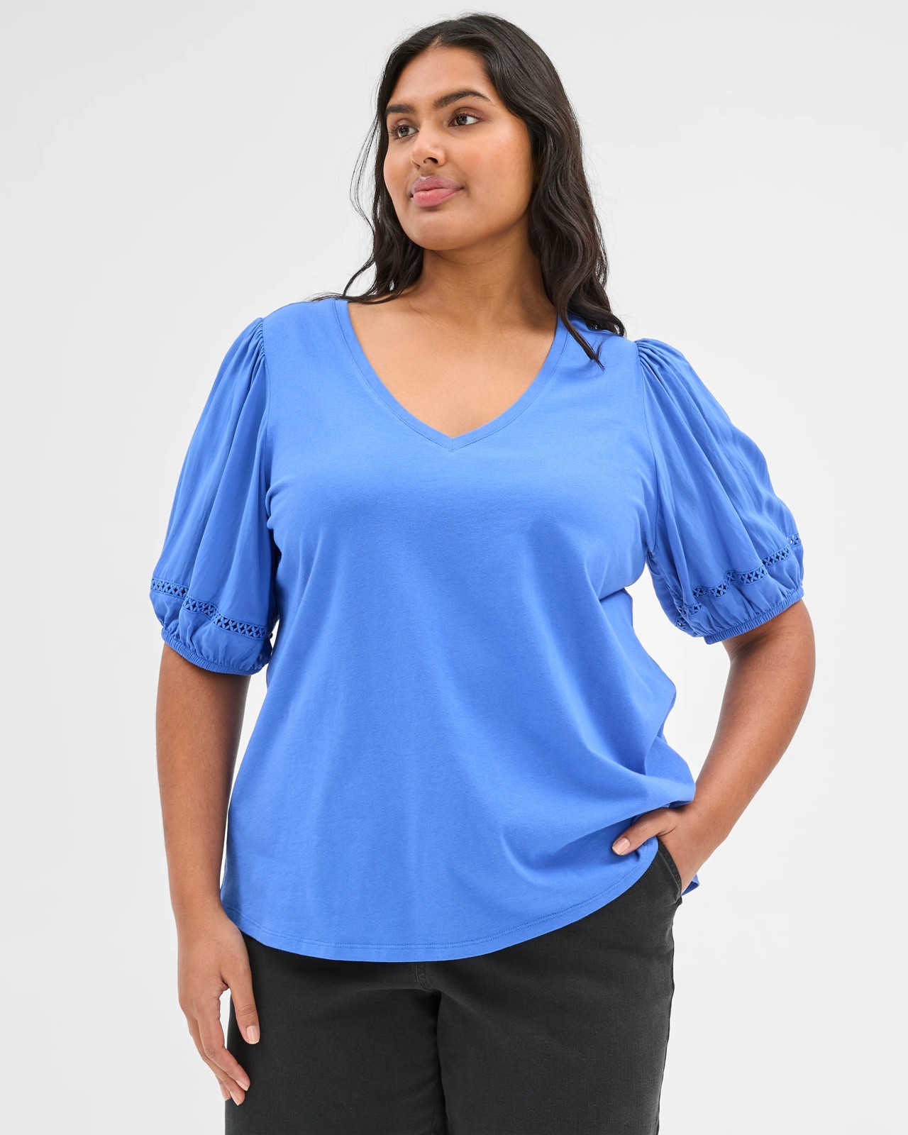Step out in style with this plus size puff sleeve knit and woven top, designed for comfort and an effortlessly chic look. The soft cotton and viscose blend provides a lightweight, airy feel that keeps you comfortable all day long. A charming v-neckline, gentle gathering at the shoulders and playful puff sleeves with unique lace panels bring a delightful touch to your outfit. The regular fit and gently curved hem make this top ideal for wearing with your best-loved jeans or skirts. Brighten your everyday wardrobe and enjoy a refreshing update with this cheerful piece.