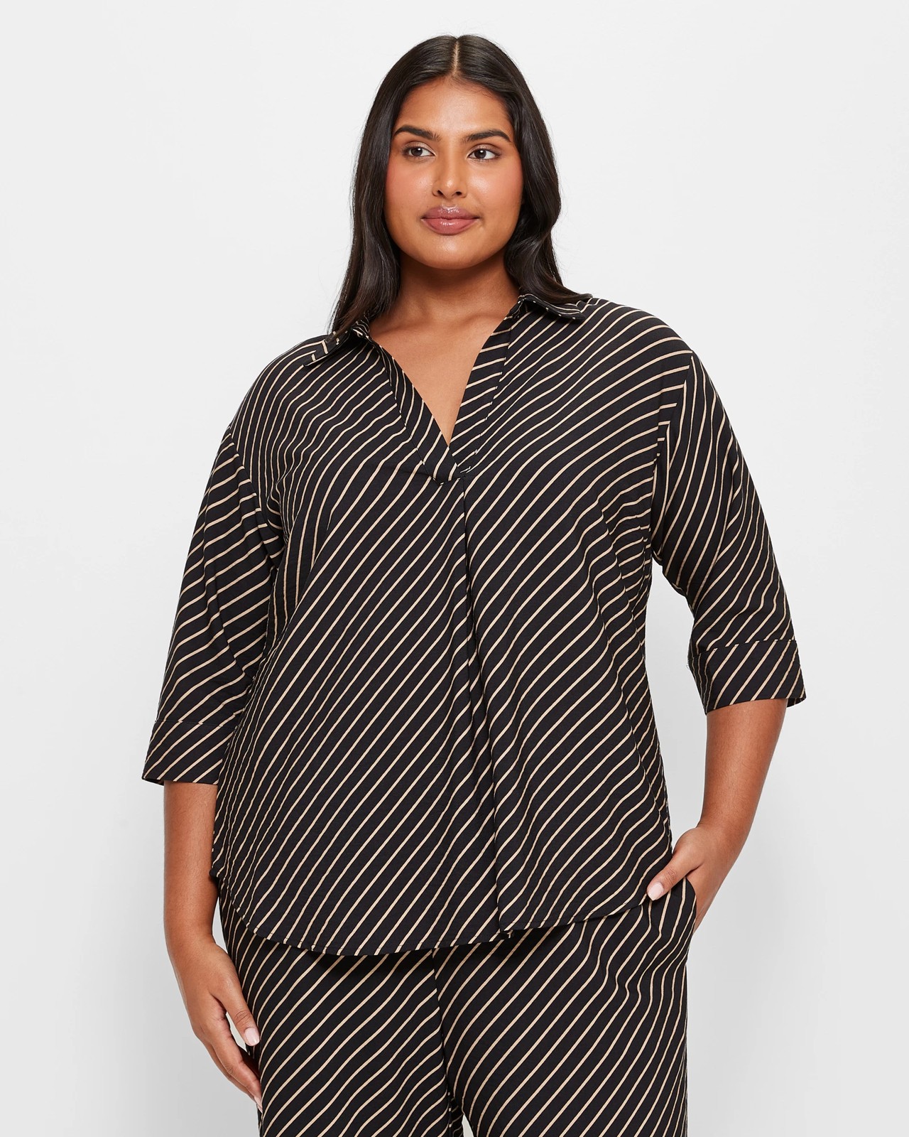 Introducing our Plus Size Pull Over Shirt, the perfect addition to your wardrobe. Made from a soft and breathable viscose/nylon blend, this shirt offers both comfort and style. The regular fit ensures a flattering silhouette, while the pull on design makes it easy to wear. Featuring a round collared neckline with a v-front drop and a notch pleat detail, this shirt adds a touch of elegance to any outfit. The mid length cuffed sleeves and curved hemline complete the look. Upgrade your wardrobe with our Plus Size Pull Over Shirt today and experience the perfect combination of style and comfort!