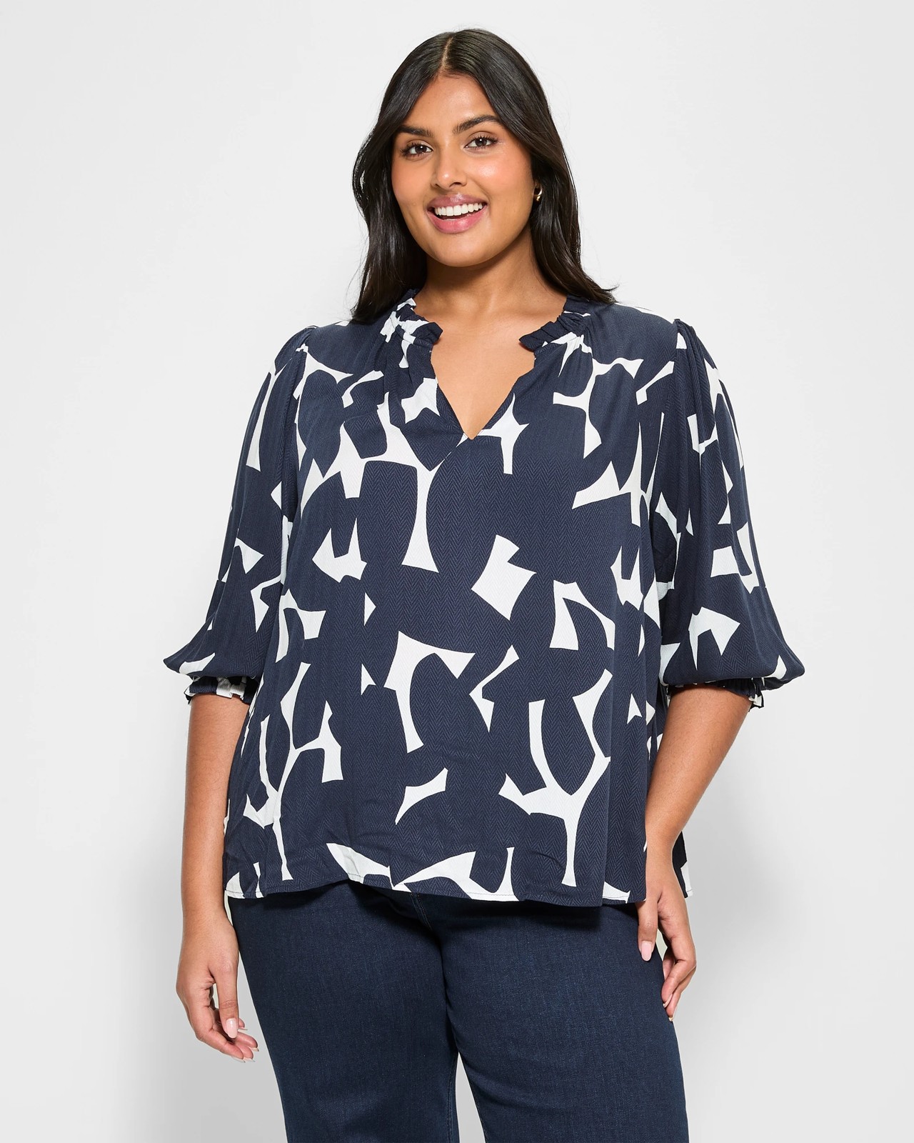 Discover the charm of our Plus Size Shirred Cuff Blouse, offering both comfort and style with its light and flowy viscose fabric. Featuring a beautiful ikat print and a unique high-low hemline, this blouse adds a touch of sophistication to your outfit. The round neckline with an upper frill and v-front drop enhances its chic appeal. The gathered shoulders and long sleeves with shirred cuffs create a polished look. Embrace this stylish piece and refresh your wardrobe today.
