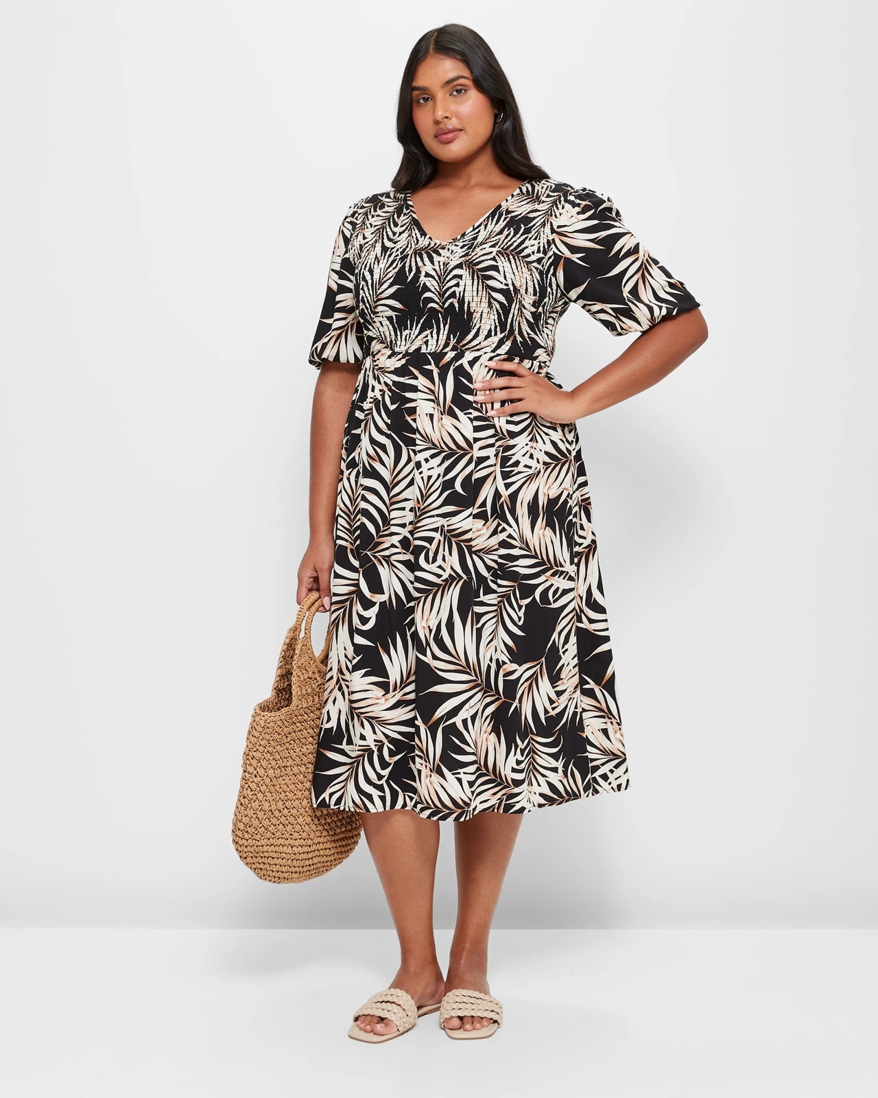 Introducing our Plus Size Shirred V-Neck Dress - the perfect addition to your summer wardrobe. Made from a lightweight viscose fabric, this dress is both comfortable and stylish. The palm print adds a touch of tropical elegance, perfect for any occasion. The shirred chest panel enhances your curves, creating a flattering silhouette. The short elastic cuff sleeves add a trendy detail, while the pleating down from the yoke panel adds a feminine touch. The midi length and straight hemline give this dress a versatile look that can be dressed up or down. Don't miss out on this must-have dress of the season! Shop now and experience the perfect blend of style and comfort.