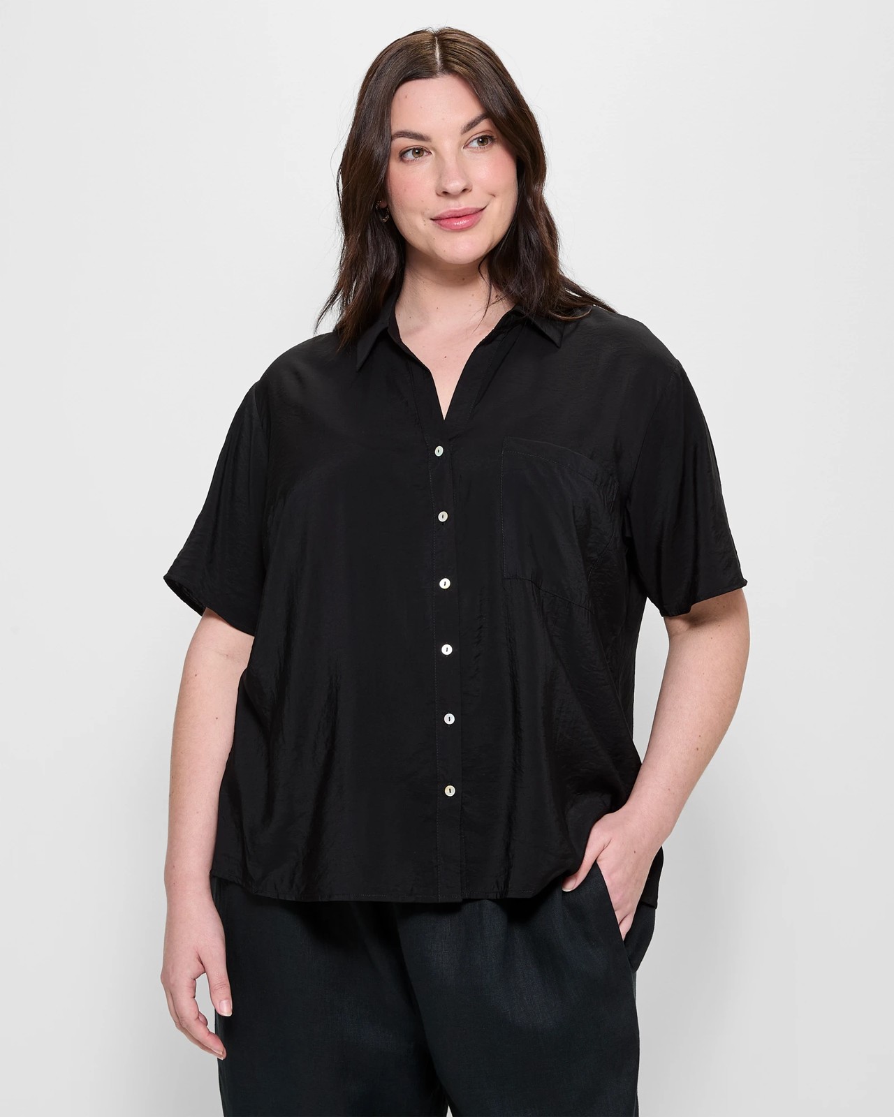 Discover the ultimate comfort and chic style with our Plus Size Shirt. This shirt is made from a luxurious viscose and nylon blend, ensuring it feels light and flows effortlessly. The easy-going fit and round collared neckline with a v-drop front make it an ideal addition to any wardrobe. With short sleeves for those warm days, a button-through front for convenience and an open chest pocket for a touch more practicality, this shirt covers all bases. Enhance your look with the stylish curved hemline. Try it today and add versatile charm to your collection!