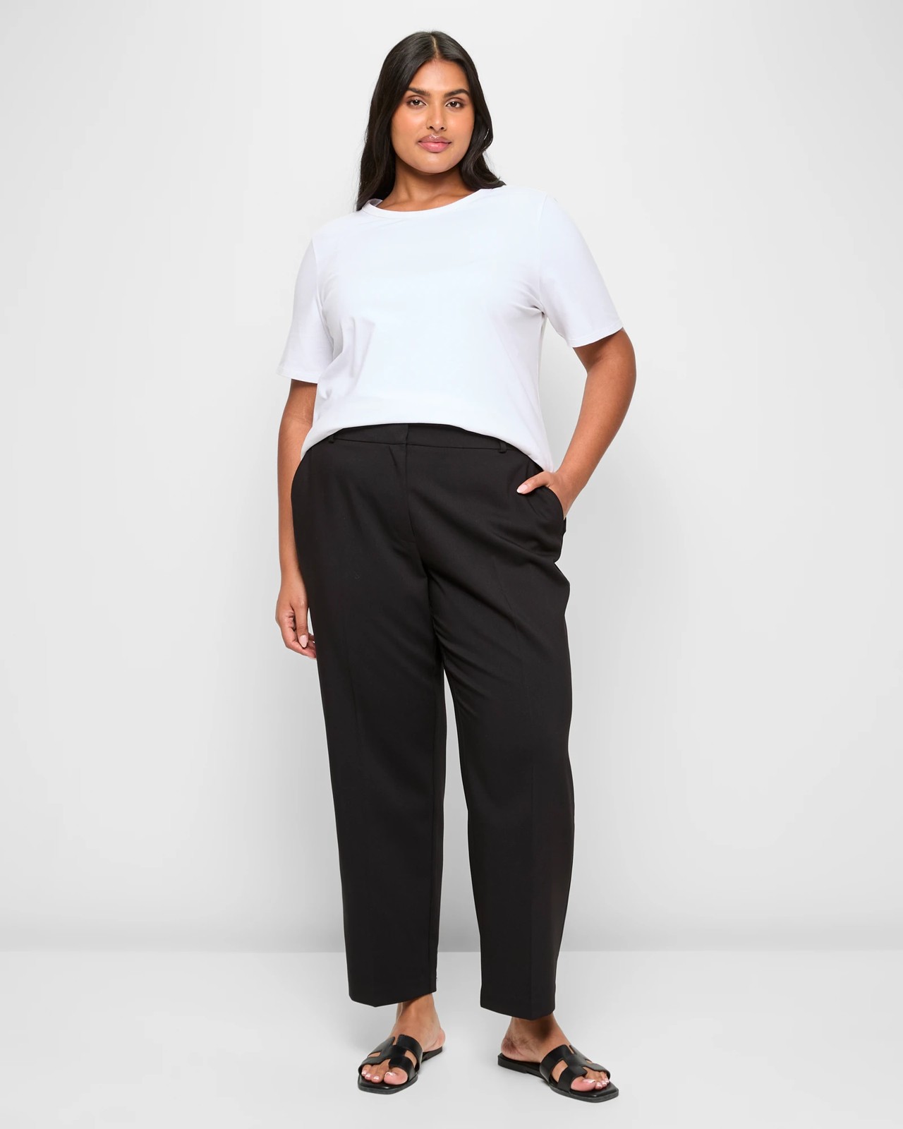 These plus size straight leg trousers are designed for both comfort and style. Made from a polyester and viscose blend with stretch elastane, they provide a relaxed fit. The thick waistband with belt loops and double clasp and zip fly closure ensures secure wear. These trousers feature practical side and back pockets, along with a timeless black colour for versatile wear. Perfect for any occasion, enhance your wardrobe with these full-length, straight-cut trousers and step out feeling confident.
