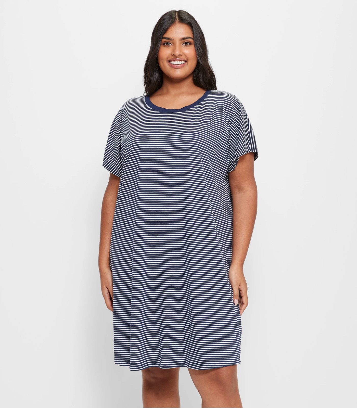 Welcome to comfort! Indulge in a restful night's sleep with our Plus Size Stripe T-Shirt Nightie. Crafted from soft cotton, the nightie offers a lightweight and airy feel. Featuring a stylish navy blue and white stripe design, a ribbed crew neckline, and short sleeves - comfort meets style effortlessly. The regular fit and short length ensure maximum ease for lounging or bedtime. Treat yourself or a loved one to a serene night's rest with our delightful nightie. Sweet dreams await!