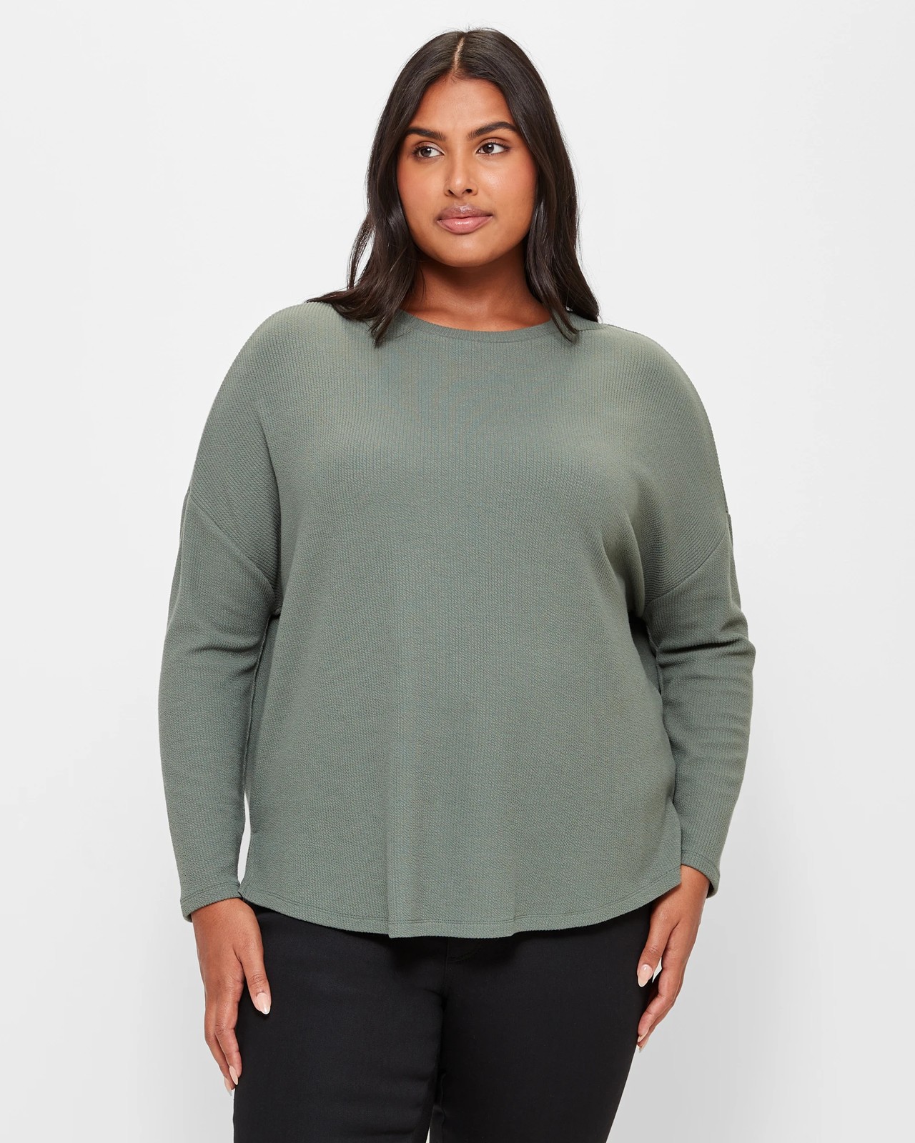 Elevate your style with our Plus Size Textured High Low Top. This curve top is made from a sustainable blend of polyester and viscose, ensuring maximum comfort and a flattering fit. The all over textured ribbed design adds a touch of elegance to your look. With its regular fit and stretchy fabric, this duck green top is perfect for everyday wear. It features a round ribbed neckline, drop shoulder, and long sleeves for added versatility. The curved high-low hemline adds a unique twist to this classic piece. Embrace your curves and rock this top with confidence. Upgrade your wardrobe today!