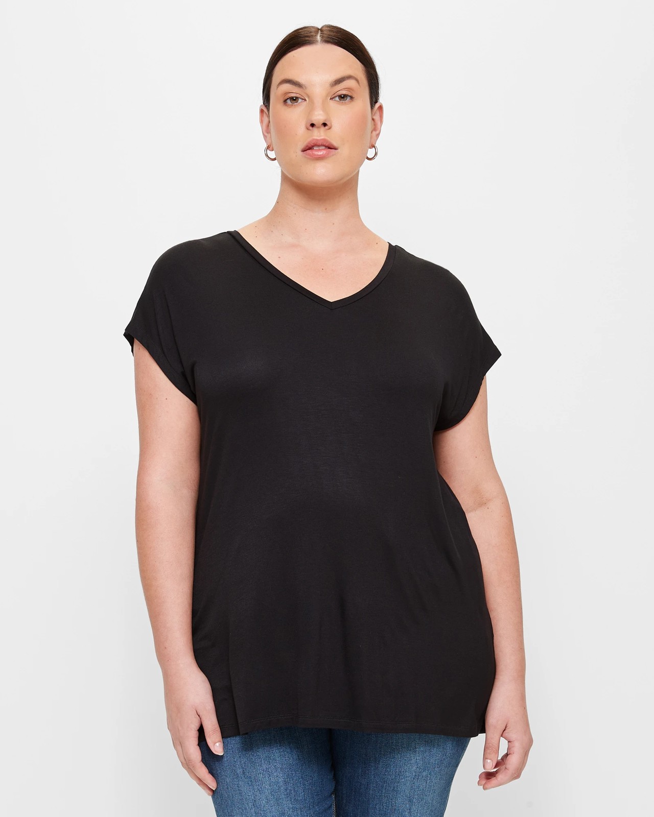 Introducing our latest addition to the Curve collection - the Plus Size V-Neck T-Shirt. Crafted with utmost care, this t-shirt is made from a high-quality viscose rich fabric that offers a comfortable and flattering stretch. Its soft and luxurious touch ensures you'll feel amazing all day long. The relaxed fit drapes beautifully on your curves, giving you a confident and stylish look. Whether you're dressing up or down, this black V-neck t-shirt is perfect for any occasion. Complete with short sleeves and a straight hemline, it's a versatile piece for your wardrobe. Upgrade your style today by owning this must-have t-shirt! Don't miss out - get yours now!