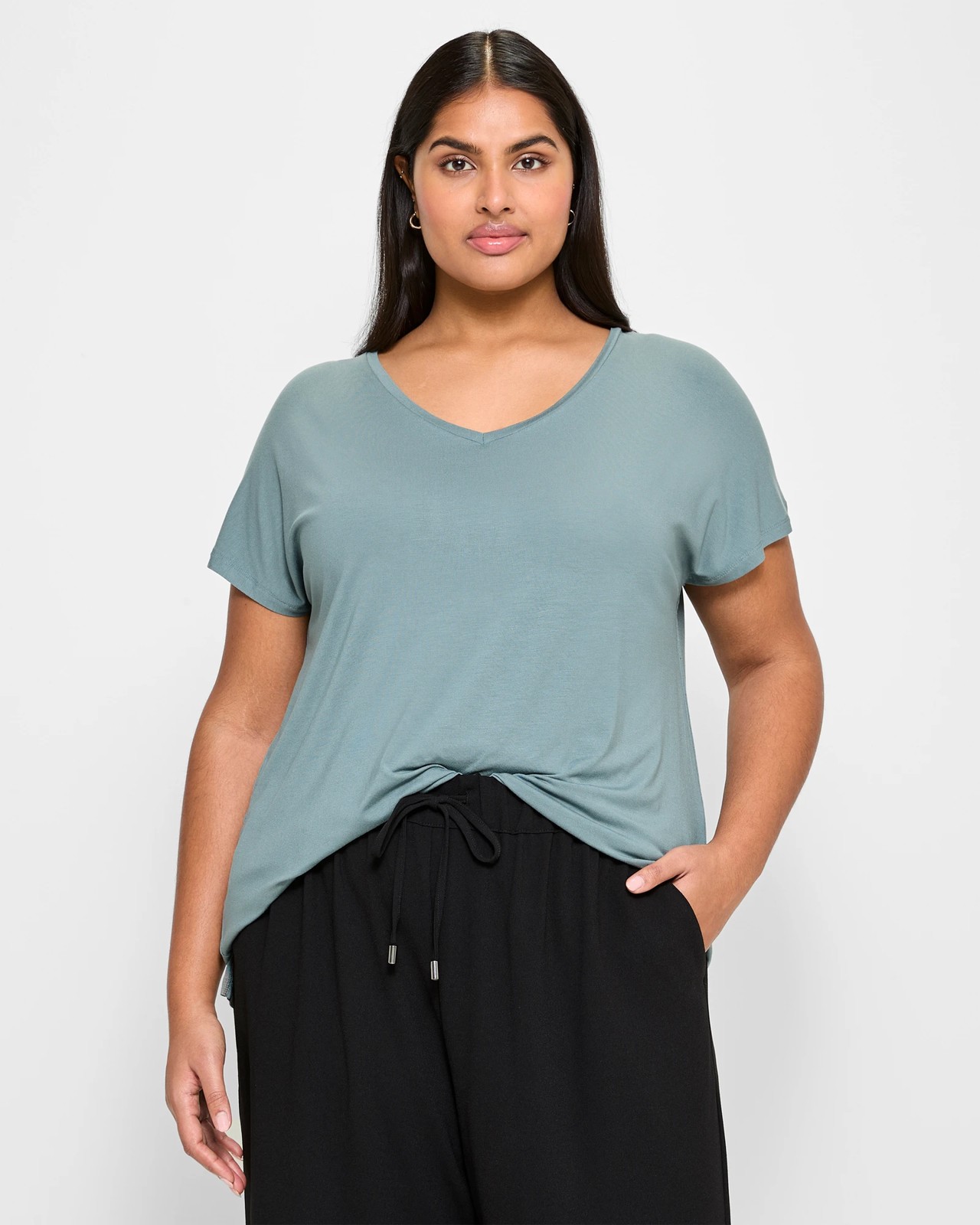 Embrace comfort and style with our Plus Size V-Neck T-Shirt. This curve tee is made from a luxurious viscose rich fabric, providing a lightweight and soft feel with ample stretch for optimal comfort. The regular fit, v-neckline, short sleeves and straight hemline make it a versatile wardrobe essential. Designed with small side seam splits, it offers a flattering silhouette with added movement. Elevate your everyday look with this effortlessly chic t-shirt that effortlessly transitions from day to night.