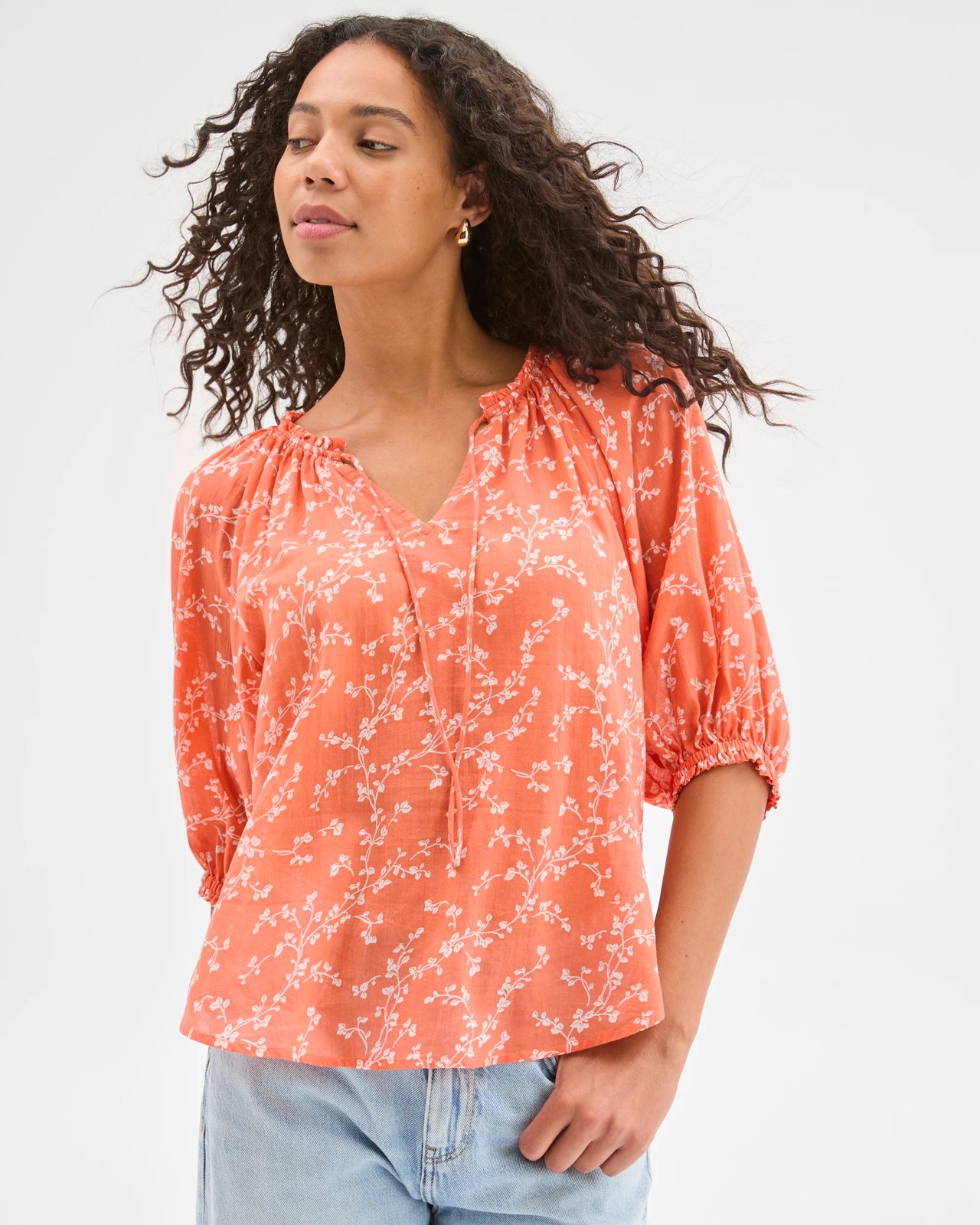Start every day feeling your best with the Poet Print Blouse, the top that instantly lifts your wardrobe and your mood. Made from wonderfully light and breathable cotton, this blouse helps you stay cool and comfortable throughout your busiest days. The round neckline features a charming frill and a graceful front tie, giving your outfit a soft, feminine touch. Gathering at the neckline and stylish puff sleeves add to its elegant appeal, while the relaxed fit gives you confidence and freedom to move. Pair it easily with jeans or smart trousers whether you are heading to work or meeting up with friends. Make the Poet Print Blouse your new favourite and add a sprinkle of effortless style to your everyday. Treat yourself to comfort and timeless style today.