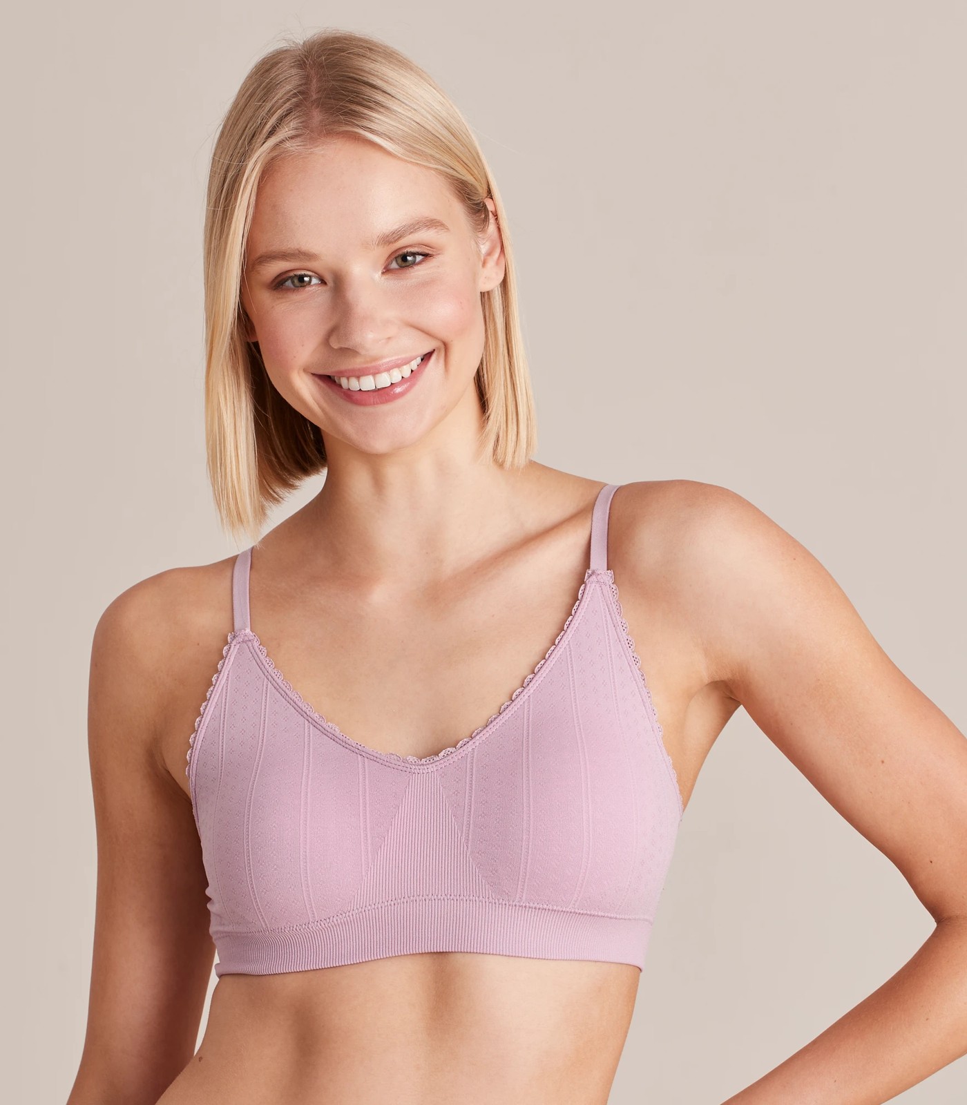For the woman who loves comfort without the restriction of wire, the Lily Loves pointelle crop top is wirefree, has adjustable shoulder straps and removable padded cups.