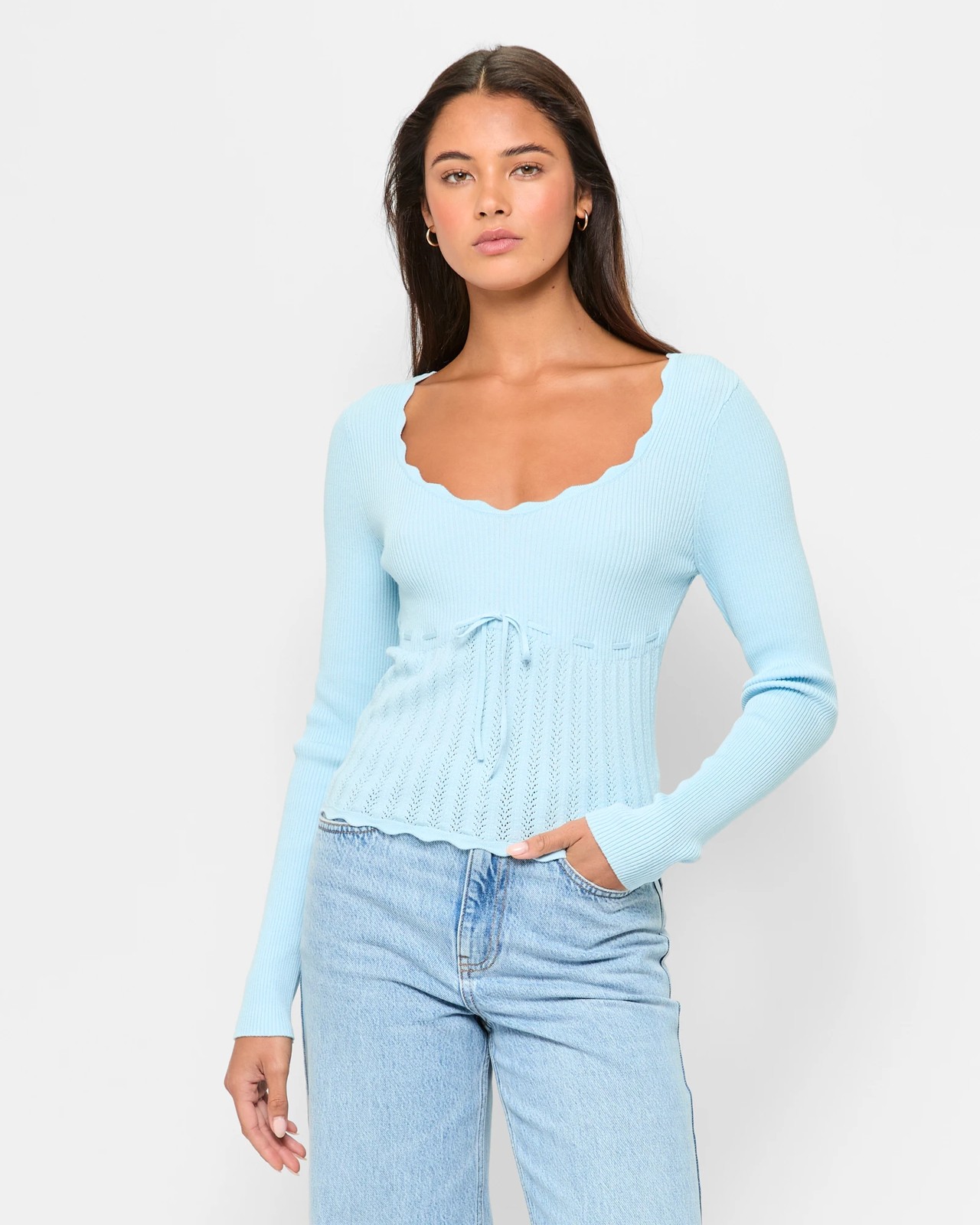 The Pointelle Knit Top by Lily Loves adds a touch of charm to your wardrobe. This comfortable top combines viscose and nylon for a soft, smooth feel against your skin. Featuring an all-over knit design and ribbed detailing through the chest and arms, this top offers an exceptional wear. The scoop neckline with wave accent and woven tie at the waist enhance its stylish appeal. Complete with long sleeves and a beautifully unique pointelle back design, this top is perfect for any occasion. Treat yourself to a piece that balances both comfort and style.