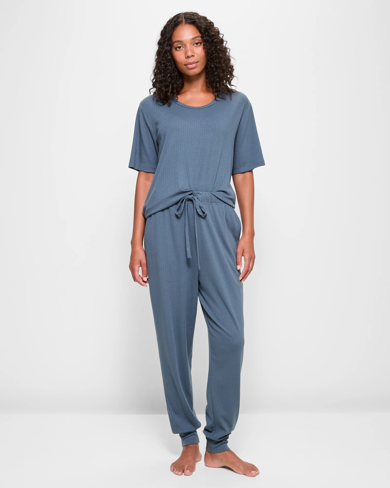 Enjoy ultimate comfort with our Pointelle Rib Pyjama Sleep Jogger Pants for women. Made from a blend of polyester and viscose, these pants incorporate stretch elastane for added flexibility. Featuring an all-over pointelle rib design, these green joggers have a regular fit and a classic jogger style. They are designed with an elastic waistband and drawstring for a personalised fit, side seam pockets for convenience, and tapered legs with cuffed hems. Complete your sleepwear set by pairing them with the matching shirt (sold separately).