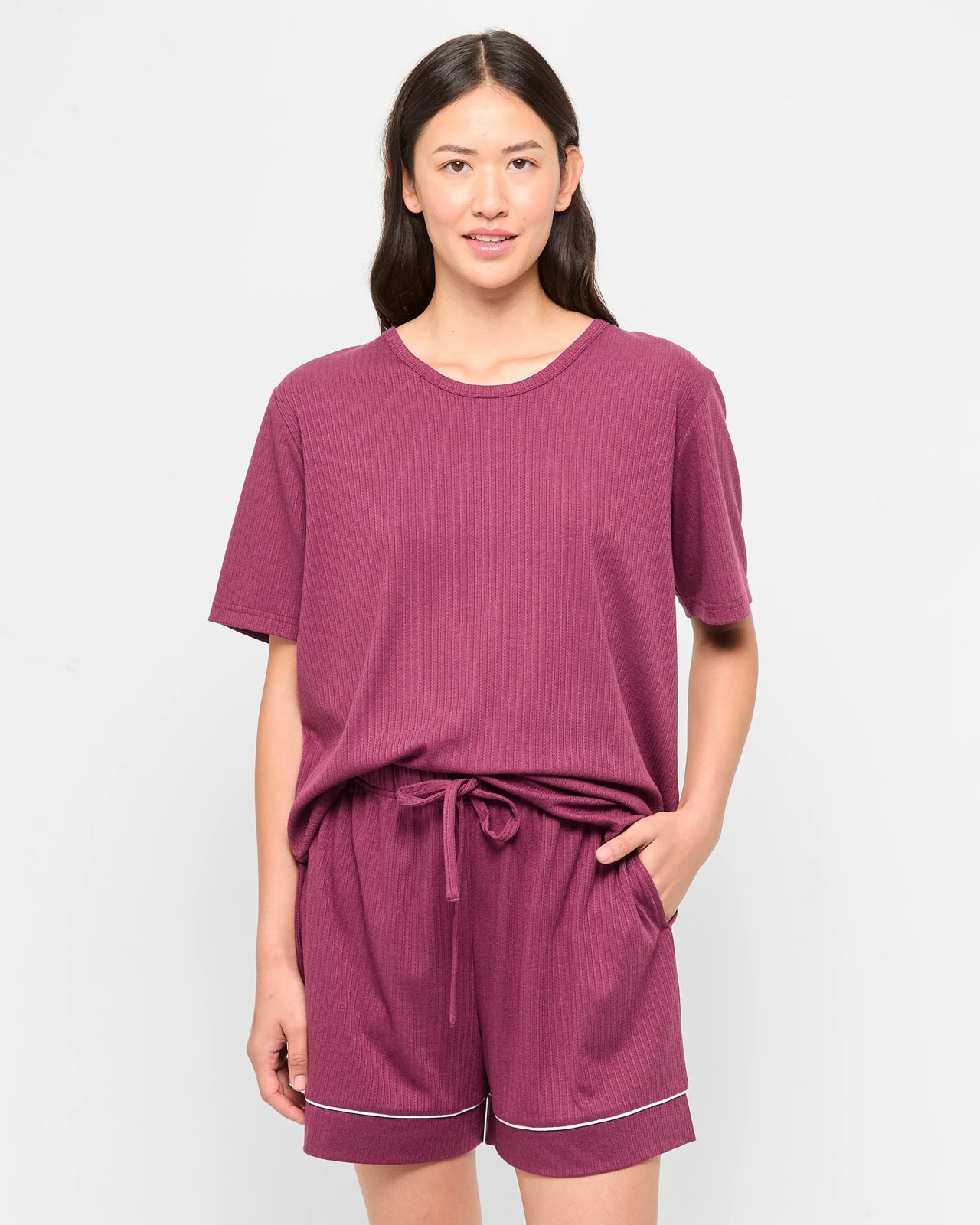 Discover ultimate comfort with this delightful women's pyjama top. Made from a blend of polyester and viscose, it includes a hint of stretch elastane for the ideal fit. The attractive ribbed pointelle design offers a touch of sophistication, while the round neckline and short sleeves ensure a relaxed feel. Featuring side seam splits and a straight hemline, this top matches perfectly with the sleep bottoms that are available separately. Indulge in cosy, stylish nights and make your bedtime routine even more enjoyable.
