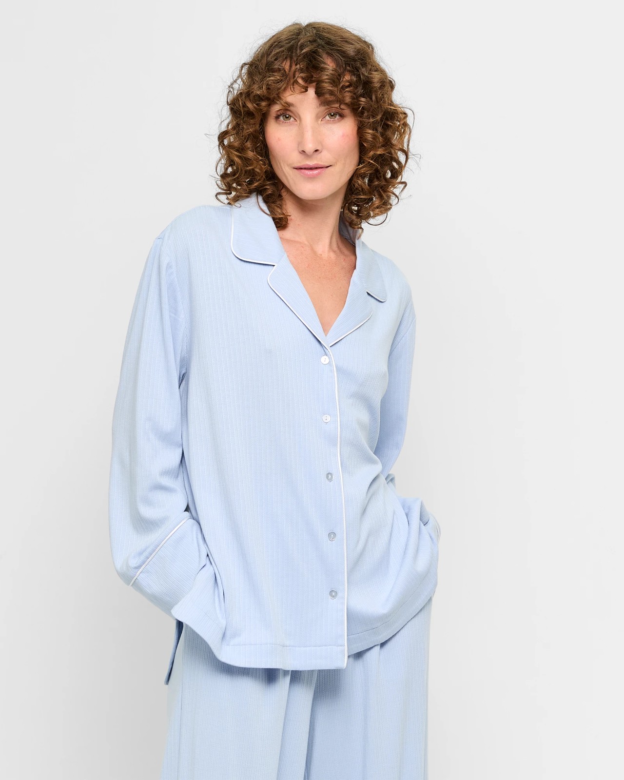 Enjoy exceptional comfort with our Women's Pointelle Rib Pyjama Sleep Top. Made from a soft blend of polyester and viscose, with added elastane for stretch, this top features a charming pointelle rib design and detailed piping around the neckline and front. The button-through front and long cuffed sleeves offer a classic touch, while the round neckline with small lapels ensures a snug fit. Pair it with the matching bottoms (sold separately) for a complete, cosy night-time outfit. Treat yourself to comfort and style tonight.