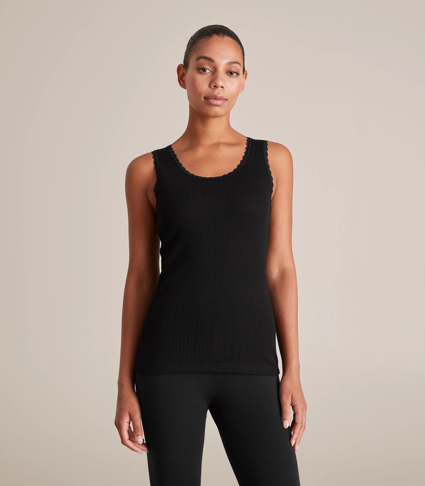The pointelle vest is fabric brushed for extra comfort. It also features thick shoulder straps for support of the sleeveless design, a scoop neckline and a soft material for comfort - perfect for keeping warm in the cold weather.