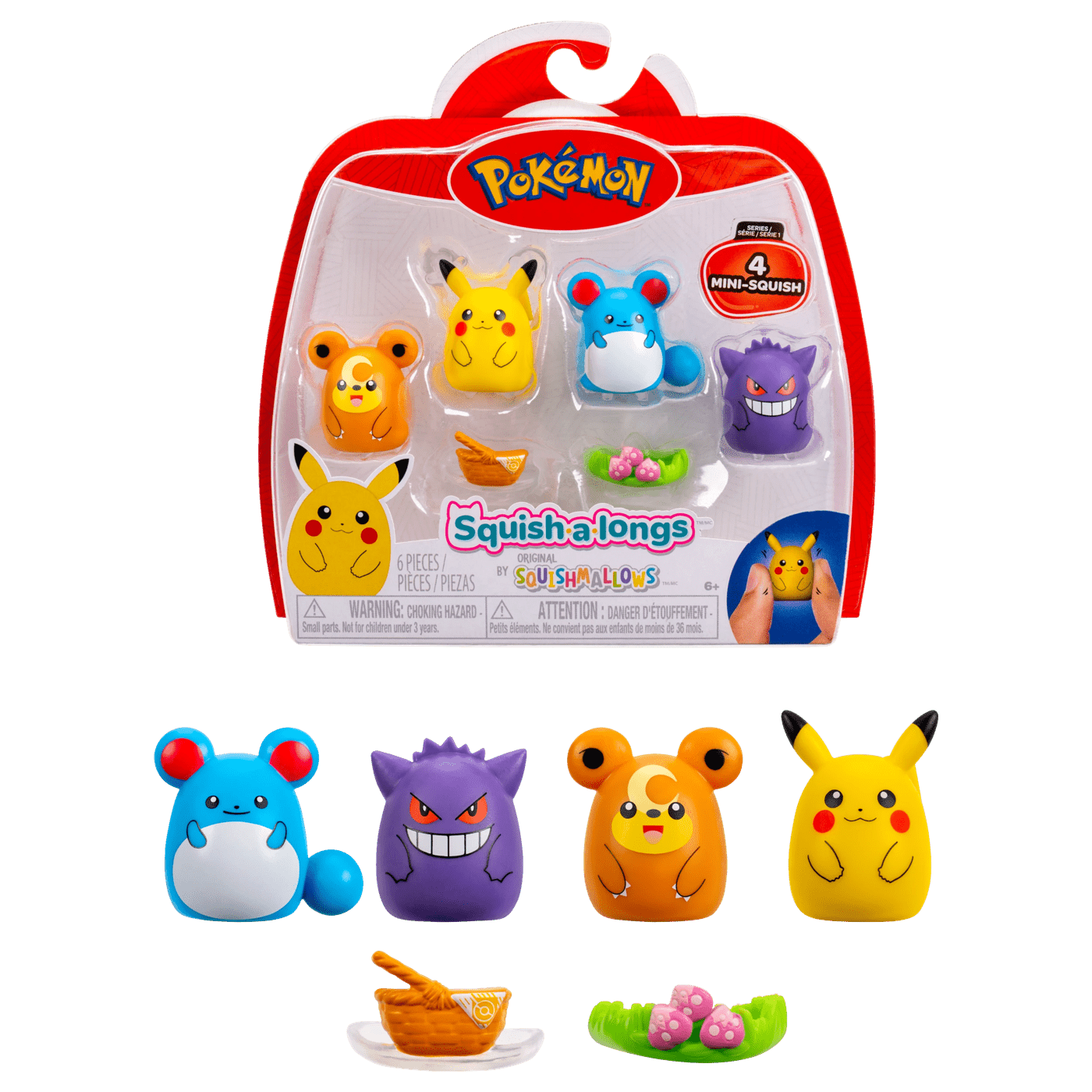 Each Squish-a-longs multipack includes 4 Pokémon Mini-Squish, as well as 2 accessories for Mini-Squish styling.