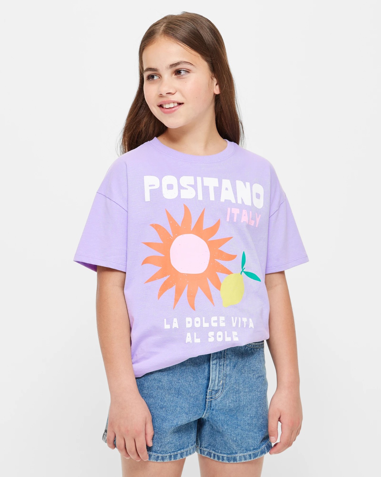 The perfect addition to any girl's wardrobe, our Positano Graphic Longline T-shirt. Crafted from a soft cotton fabric for a comfy fit and feel, this longline fit t-shirt is complete with a ribbed crew neck, short sleeves and a straight hem with side splits. The front of the garment is adorned with an eye-catching Postiano print for an added touch of style.