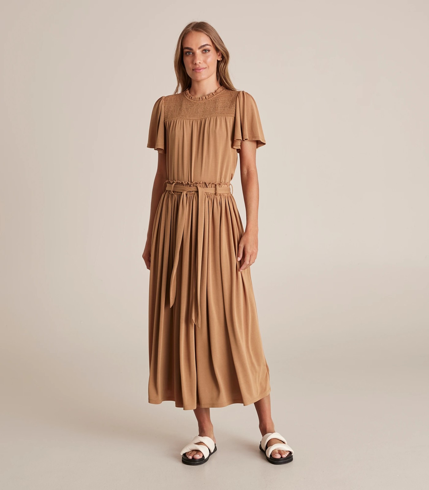 A perfect piece for a day out, the belted pull on midi skirt has a relaxed design for movement and flow, a thick elastic waistband for easy pull on and a removable tie waist belt.