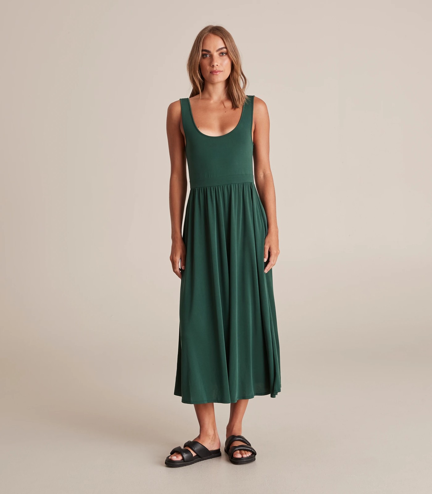 A cute everyday dress, the Preview gathered midi dress features a sleeveless desigh with thick shoulder straps, a structured waistband, a round neckline and a midi length for coverage.