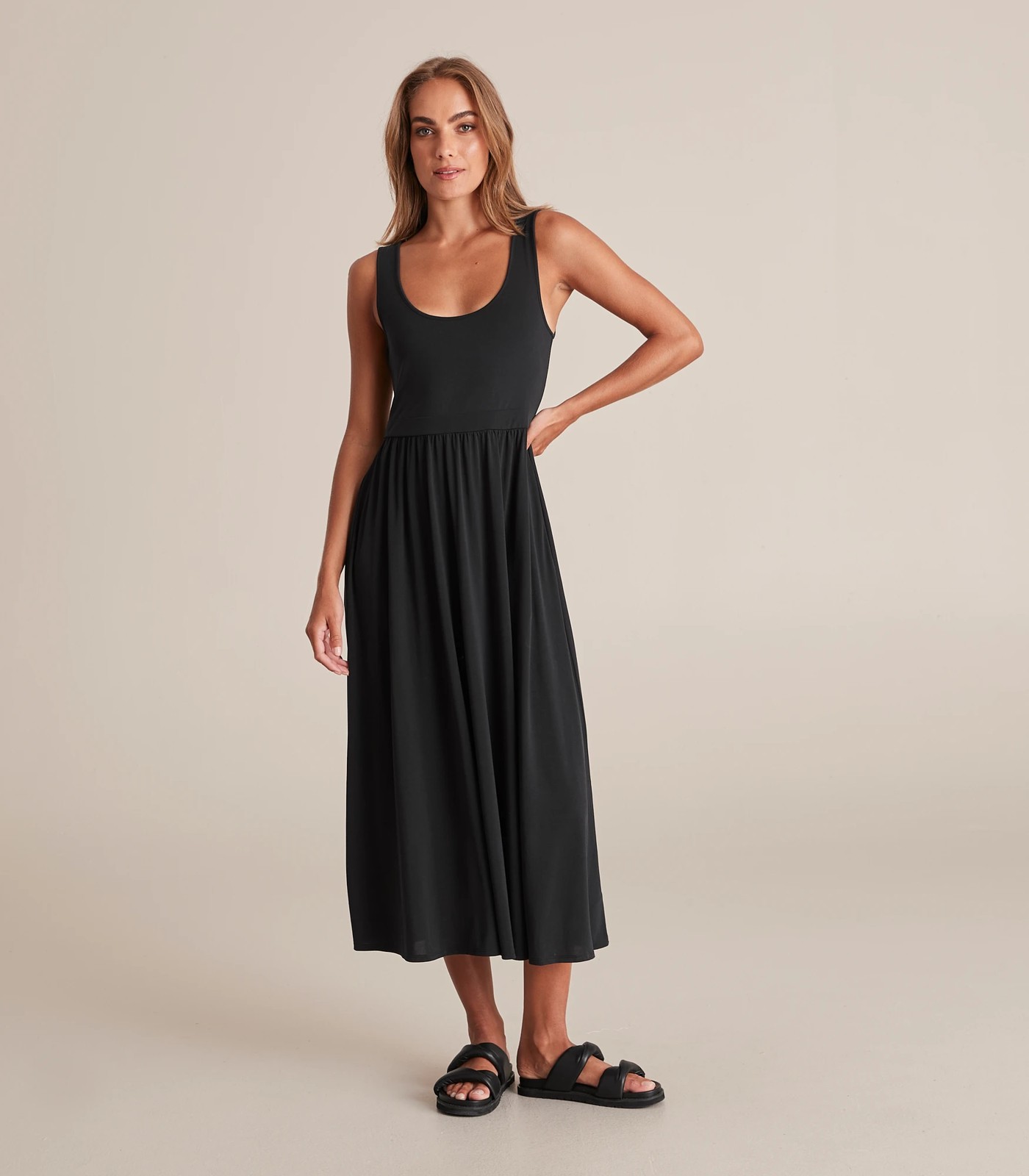 A cute everyday dress, the Preview gathered midi dress features a sleeveless desigh with thick shoulder straps, a structured waistband, a round neckline and a midi length for coverage.