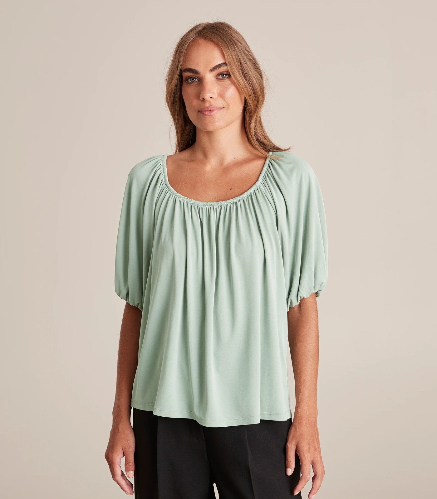A great everyday piece with a feminine flowing movement, the Preview gathered tee will be a must have for your wardrobe. It features a rounded elastic neckline, short balloon sleeves and a feminine soft modal rich fabrication.