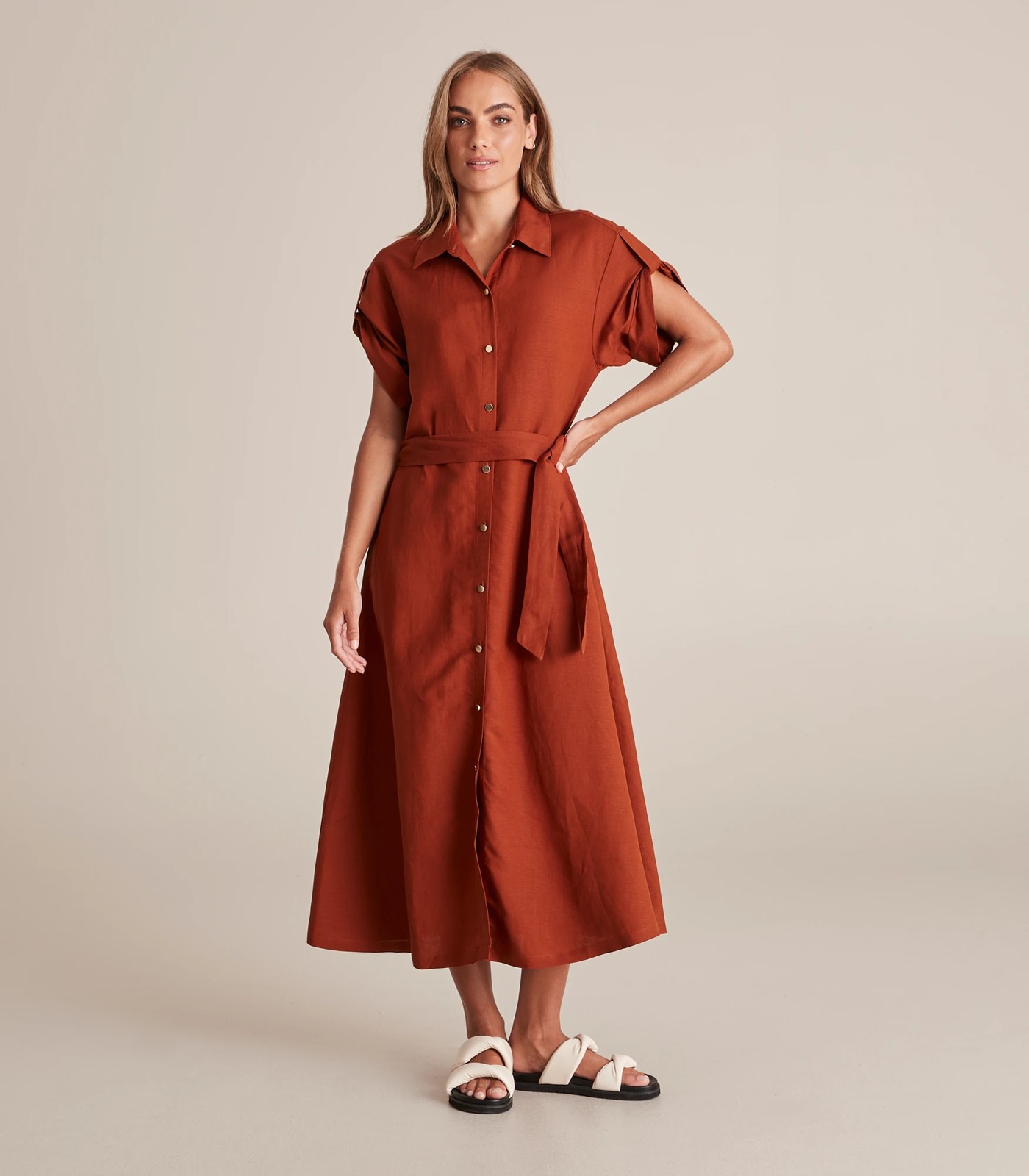 A great everyday dress for the summer season that will be worn over and over, the Preview shirt dress has a lightweight linen blended fabric, has a button through front, short sleeves and a tie waist belt.
