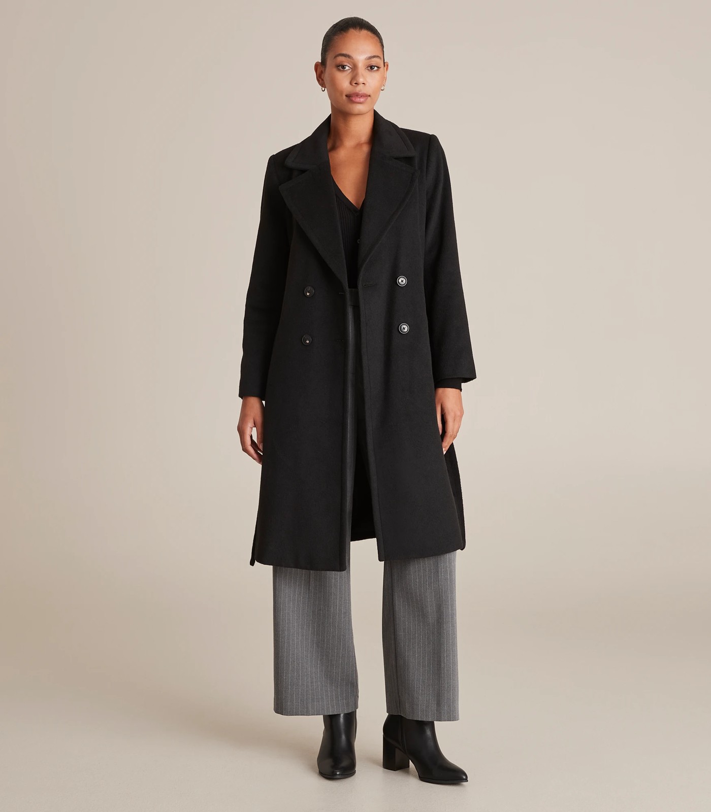 Perfect for the colder seasons, the Preview longline wrap coat will be one that will be worn for seasons to come. It features a warm woolen blend material, a removable tie waist belt and a double breasted design.
