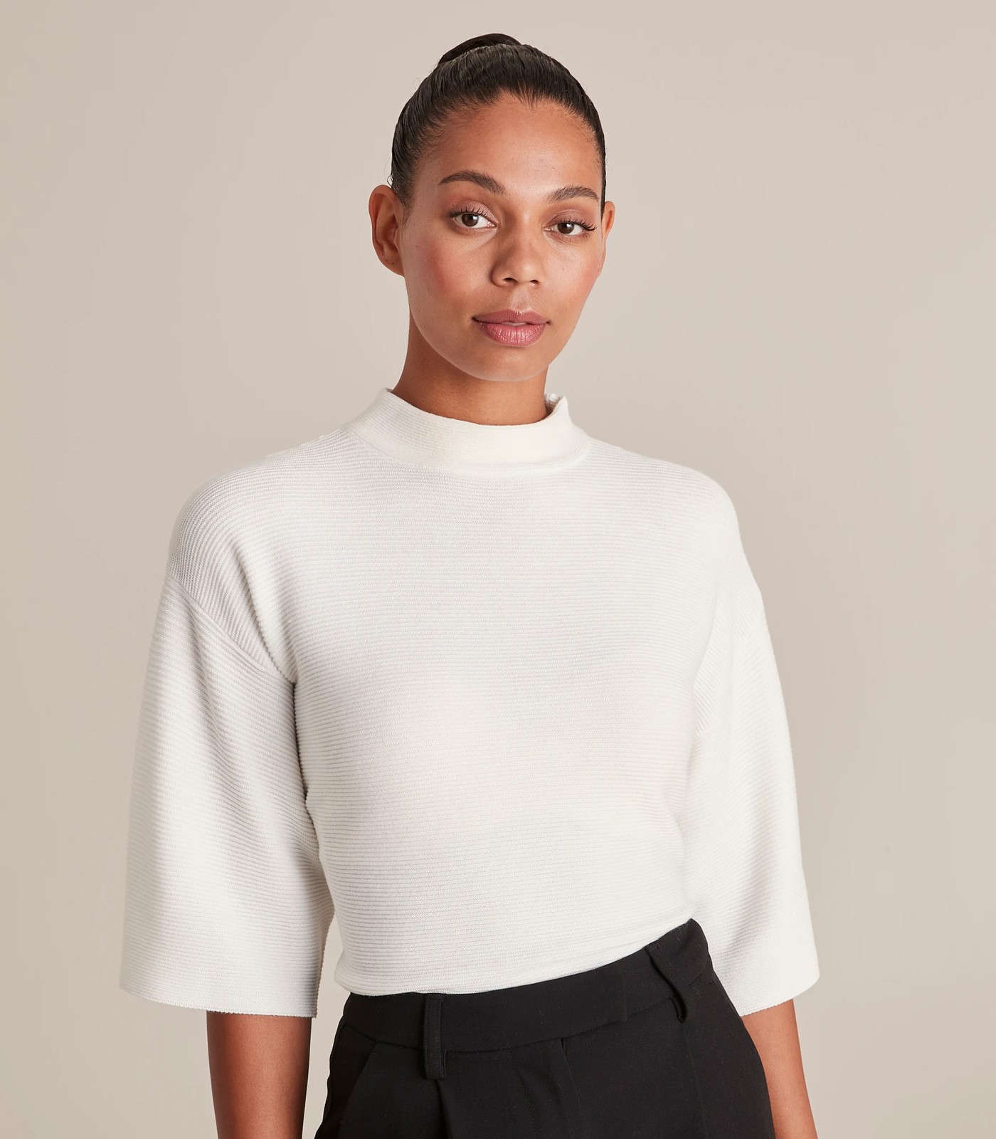 A great everyday design for the cooler months, the Preview mock neck rib knit top features a round funnel neckline, dolman sleeves and an all over ribbed knit design.