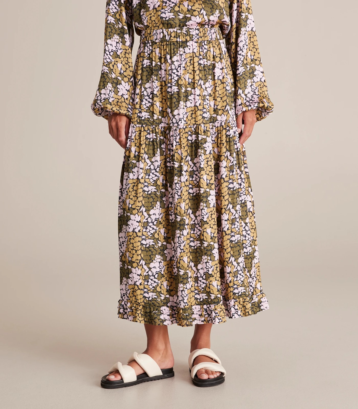 For a great skirt that is feminine and flowy, the Preview multi ruffle midi skirt features a thick elastic waistband for easy pull on, soft silky feel material, is lined and has a ruffled hemline.