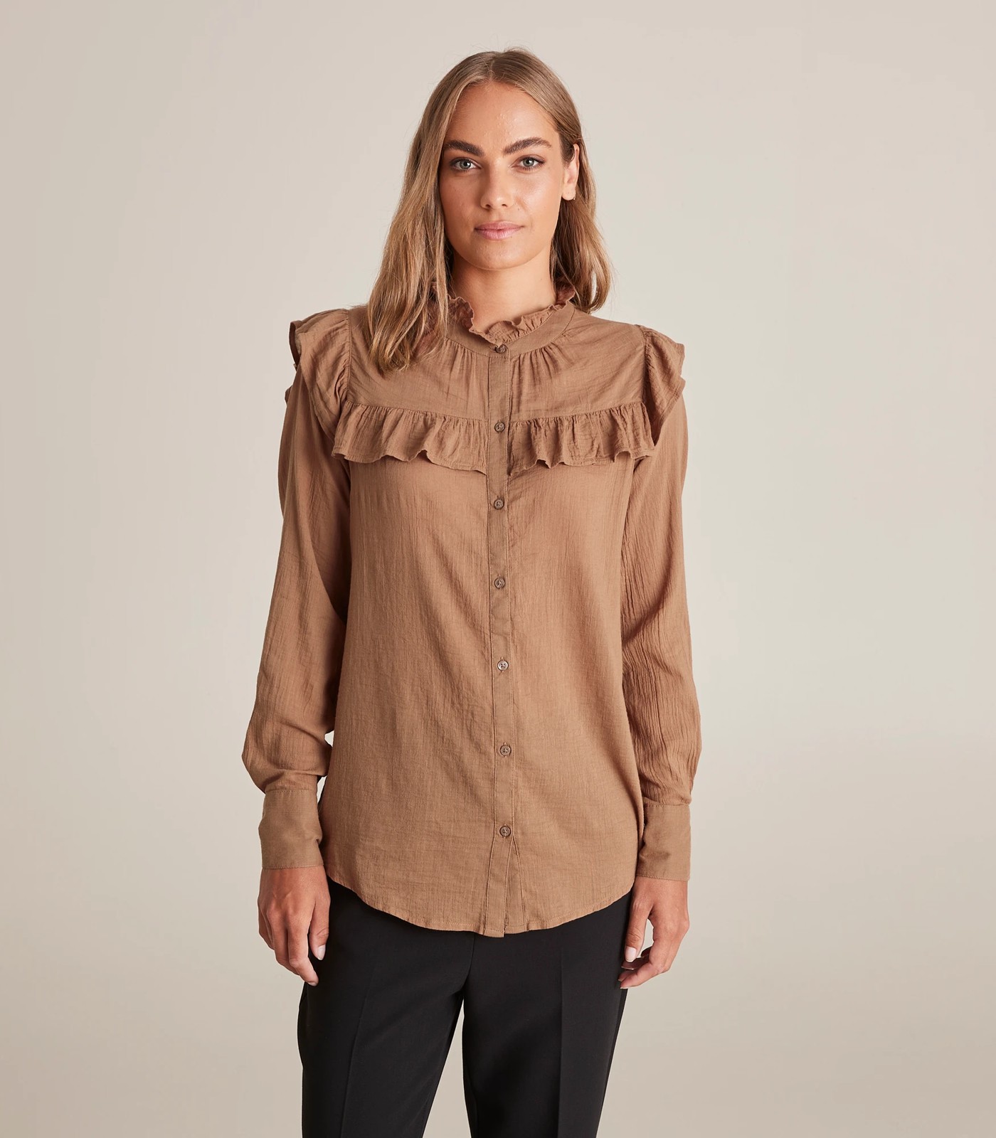 A cute top for everyday wear with your favourite bottoms, the Preview ruffle long sleeve top has long sleeves, a round upper frill neckline, button through front for easy pull on and frilled detailing around the shoulders to have you standing out in the crowd.